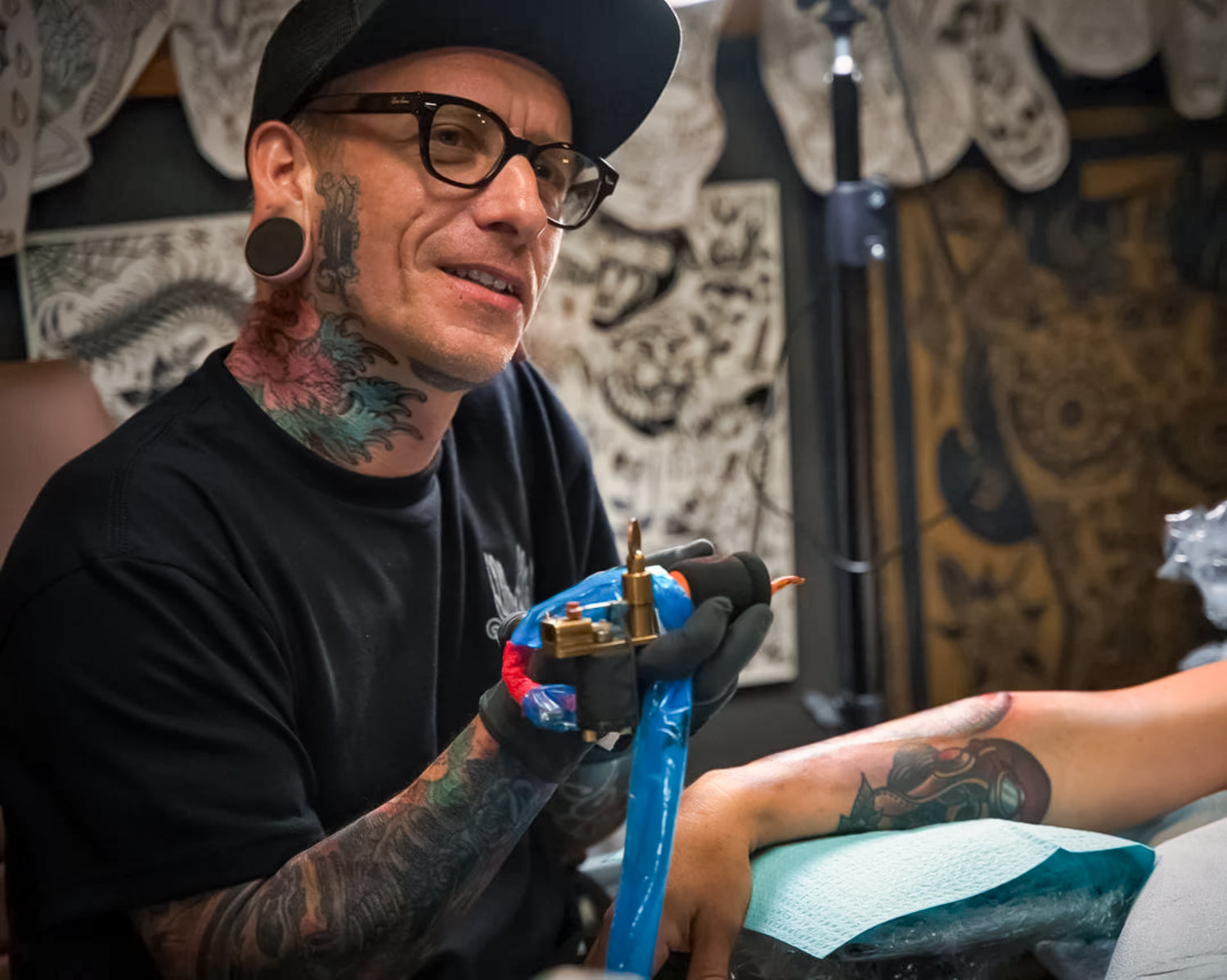 My tattooing journey began back where I was born, in Herefordshire, England. Eventually, I found myself in my current swampy location of Orlando, Florida. When I’m not tattooing at Built 4 Speed or dedicating time to Skeleton Goods, you’ll find me exploring in the woods and hanging out with my awesome son, Baxter!