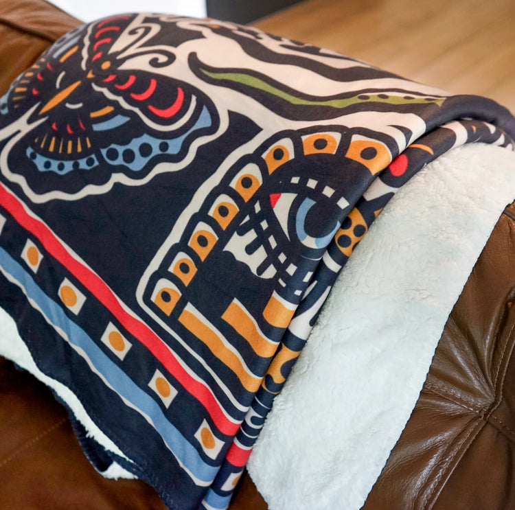 Available in both large and small sizes, this blanket brings a touch of vintage charm and personality to your home decor. Whether you're cuddled up on the couch or adding a unique accent to your bedroom, our Sherpa-Lined Fleece Blankets are sure to delight both tattoo enthusiasts and cozy comfort seekers alike.