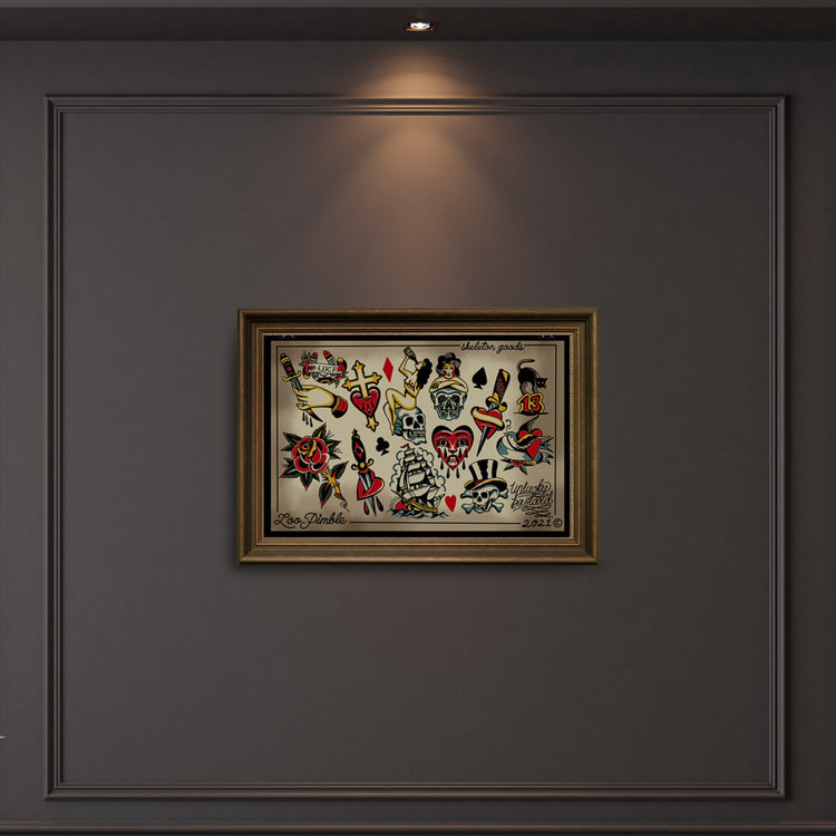 These vintage style pieces pay homage to the classics with vintage style traditional tattoo designs and an old school watercolor feel, showcasing a spectrum of neutrals, bright reds, and enduring motifs.