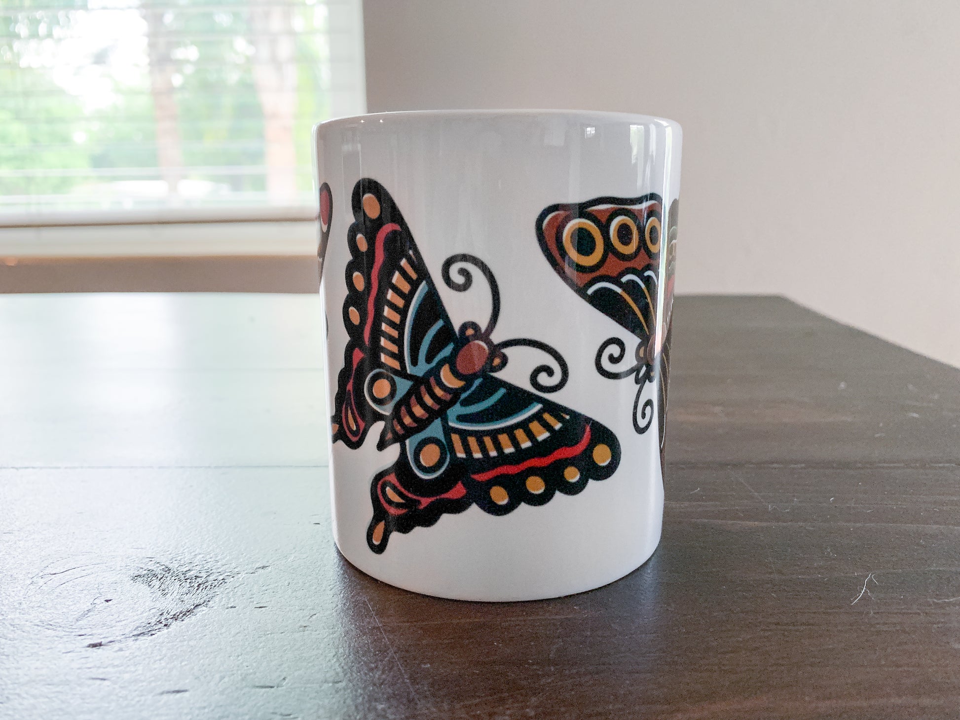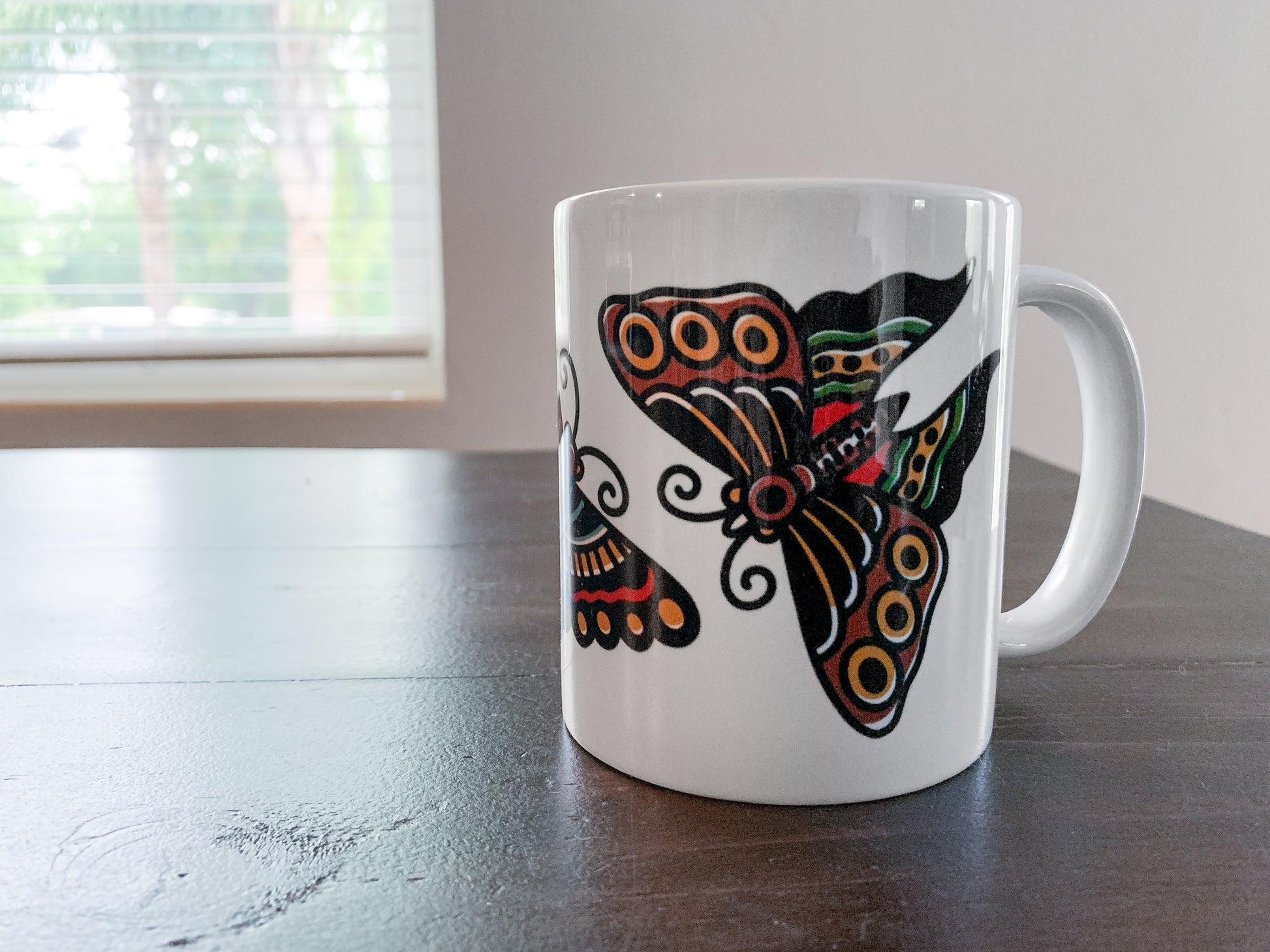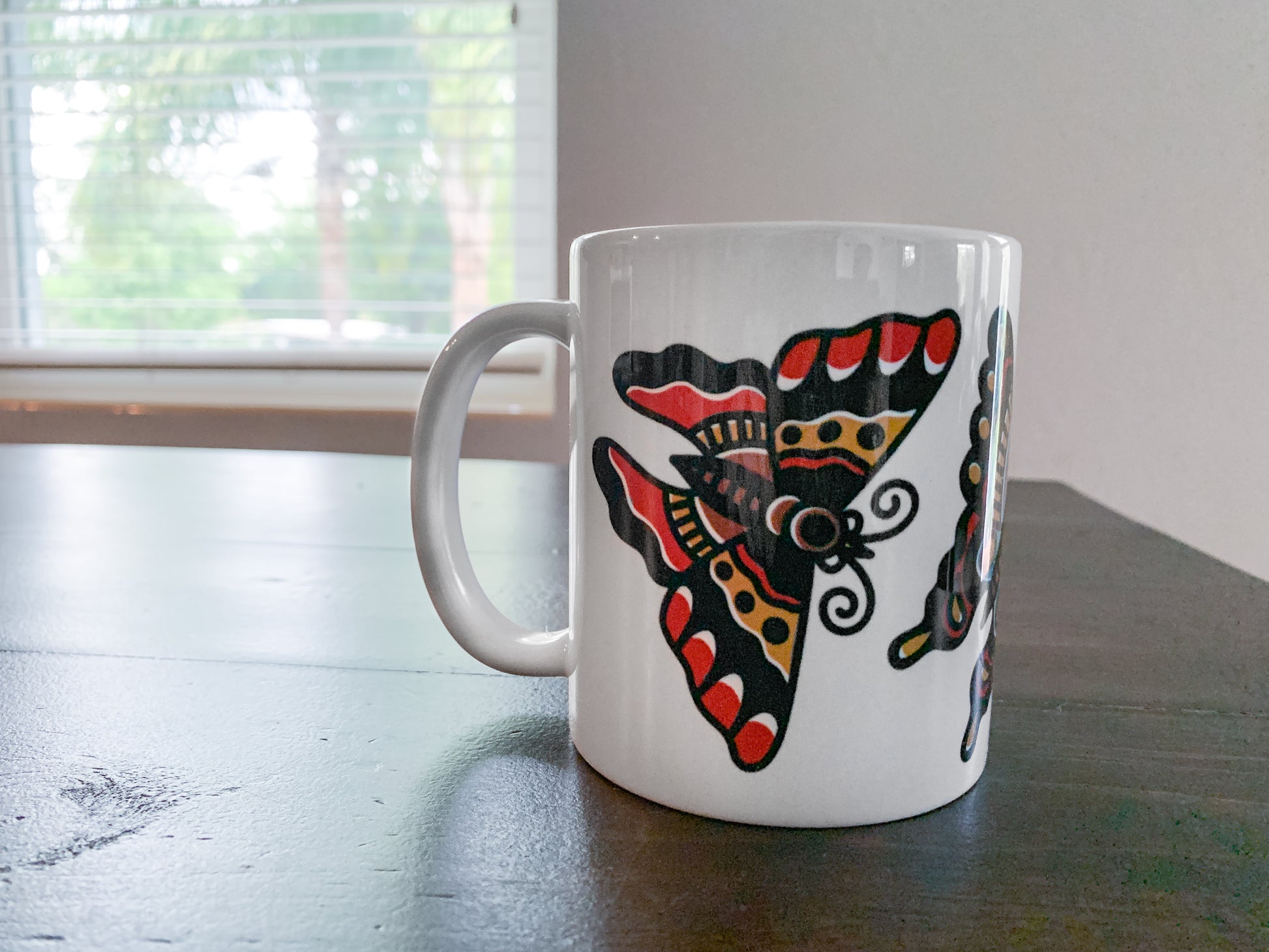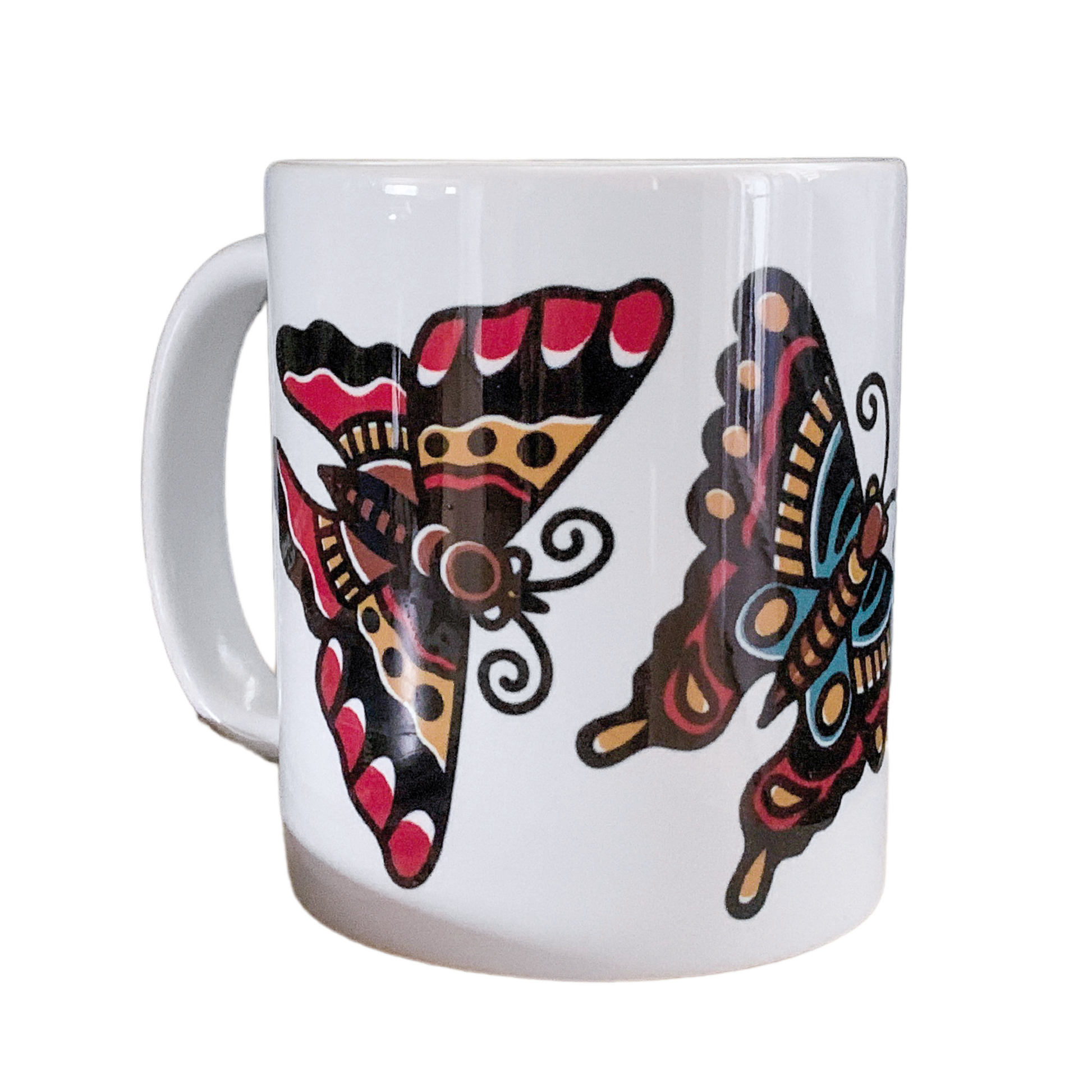 Our exquisitely crafted mugs are the epitome of style and functionality. Its generous capacity ensures ample room for your favorite hot beverages, while the ergonomic handle provides a comfortable grip for effortless enjoyment. Elevate your drinking experience and add a touch of personal tattoo style to your kitchen with our this wrap-around Butterfly design!