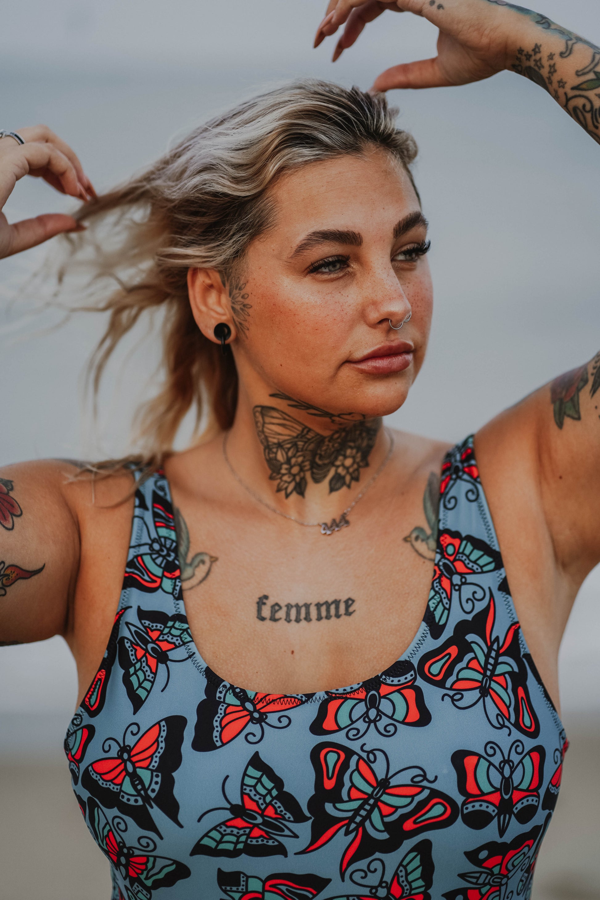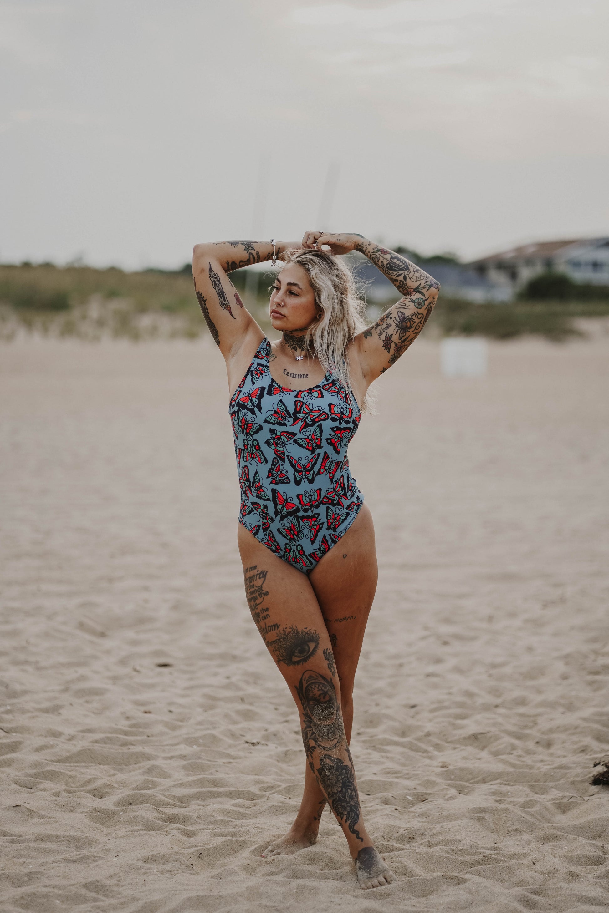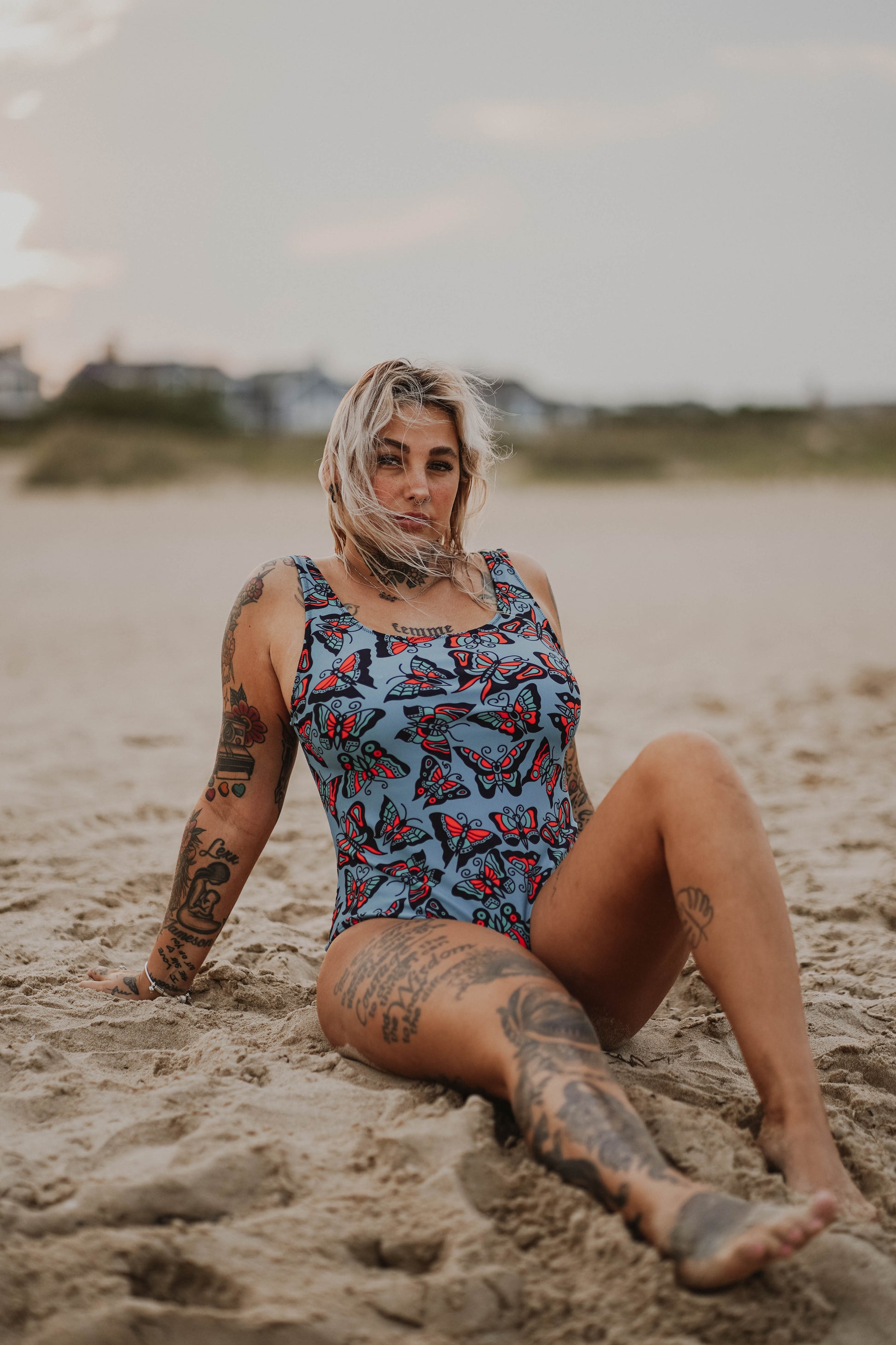 Designed for both style and practicality, this butterfly covered swimsuit is tailored to enhance your silhouette. It boasts a double-layer front for a sleek appearance with unmatched comfort, complemented by a scooped neckline. The low scooped back adds a touch of allure while the cheeky fit accentuates your best ass-ets!