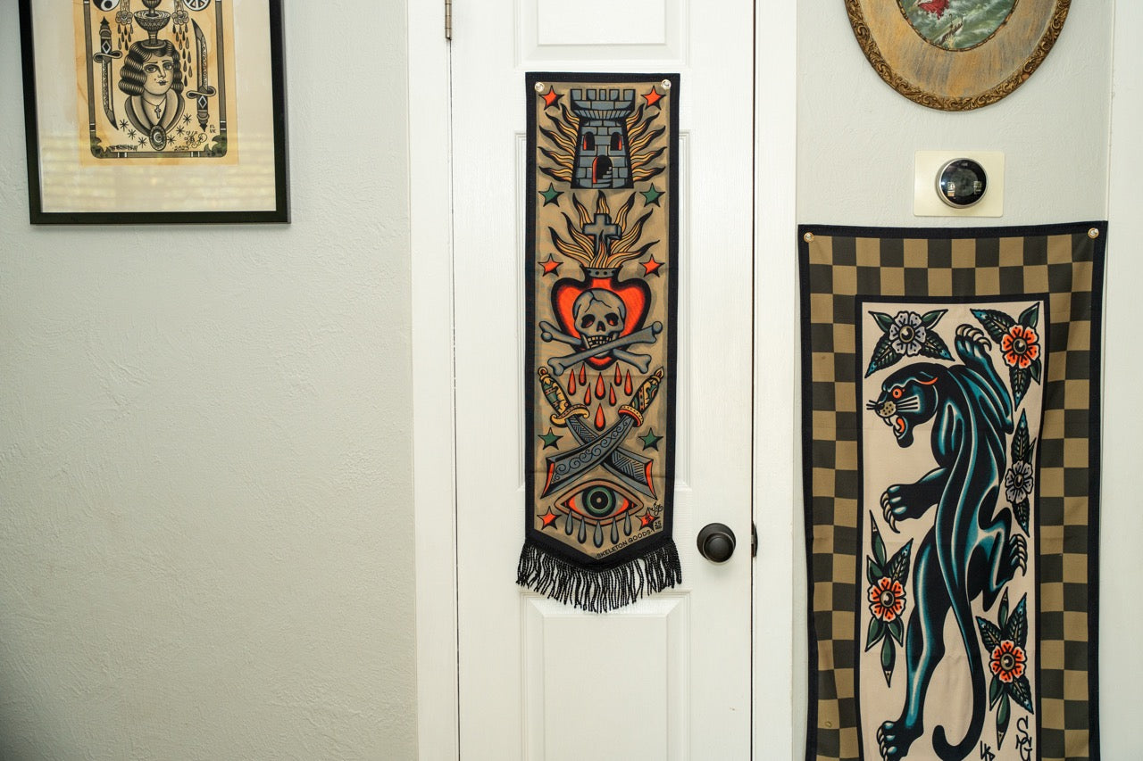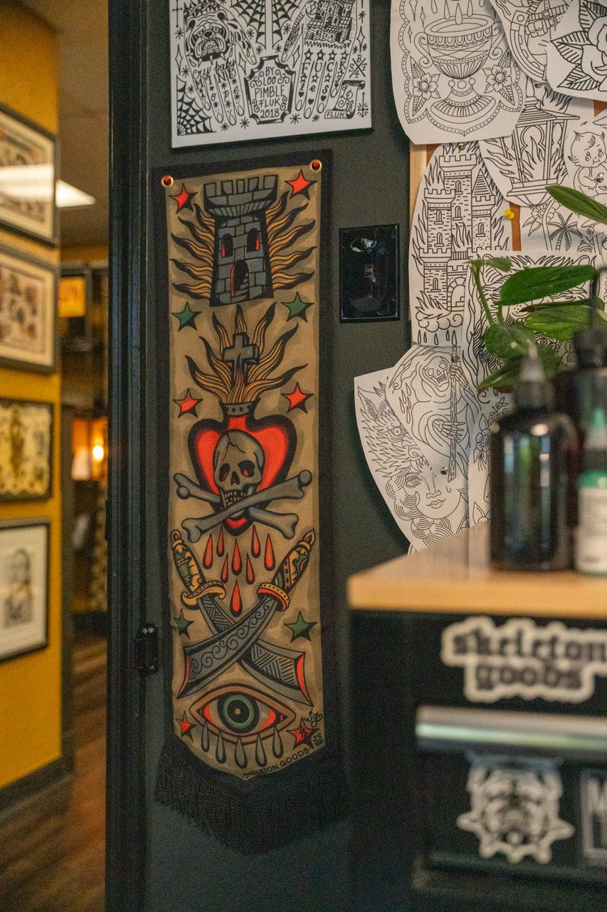 Our premium banners command attention! Designed with a keen eye for detail, our banners offer unparalleled quality and durability, ensuring they stand the test of time in any setting. All designs are created by the tattooer and Owner of Skeleton Goods, @loopimble.