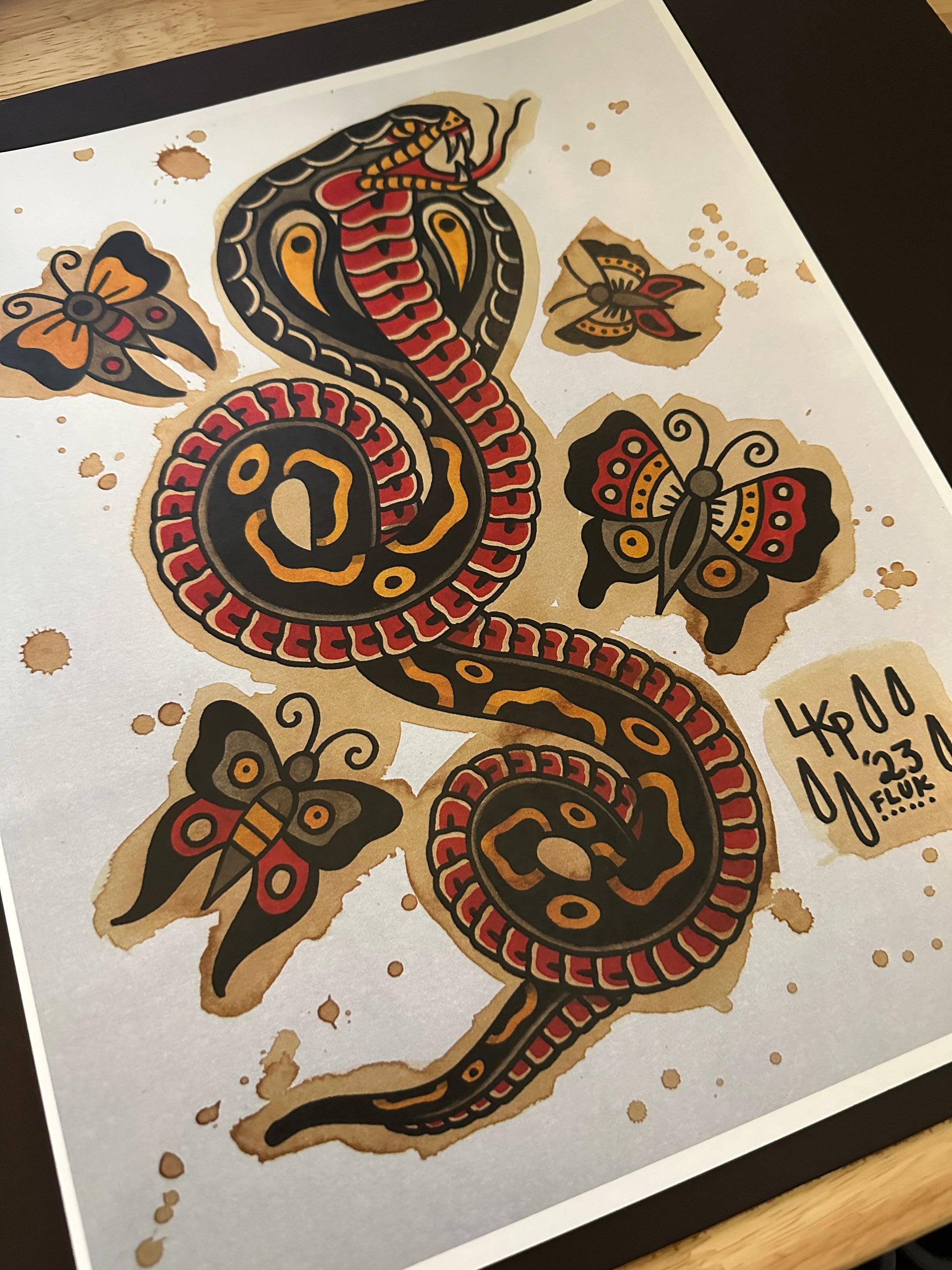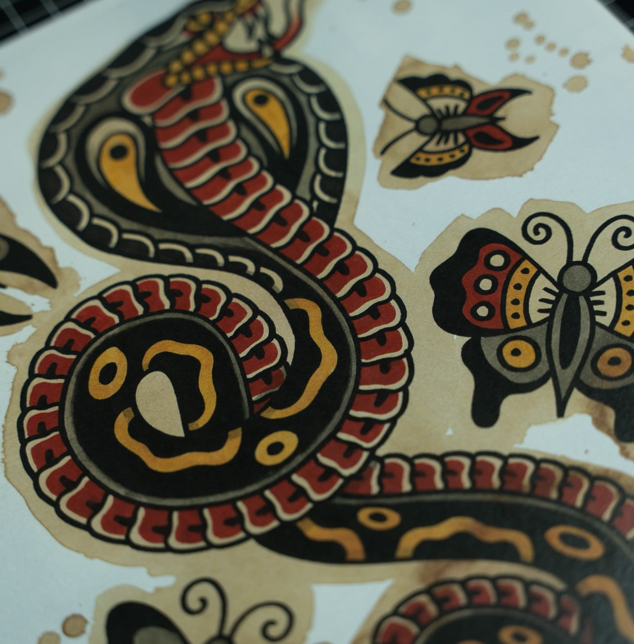 Vintage colored paper enriched with intricate color details transform a basic pinup into an extraordinary piece of flash art! All designs are created by the tattooer and Owner of Skeleton Goods, @loopimble.