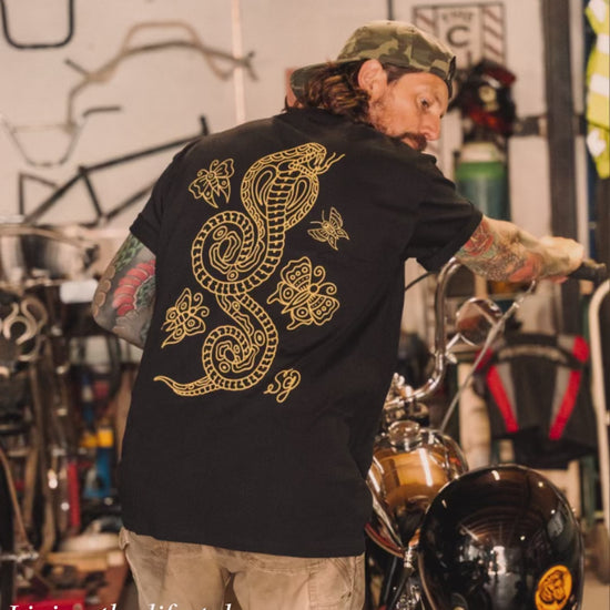Crafted with meticulous attention to detail, these shirts boast exceptional quality without compromise. This striking yellow tattoo flash design showcases a large Cobra and butterfly print on the back and small butterfly on the front. Each garment has been carefully printed at a small local shop in Orlando, Florida, and hand-packed with love by yours truly.