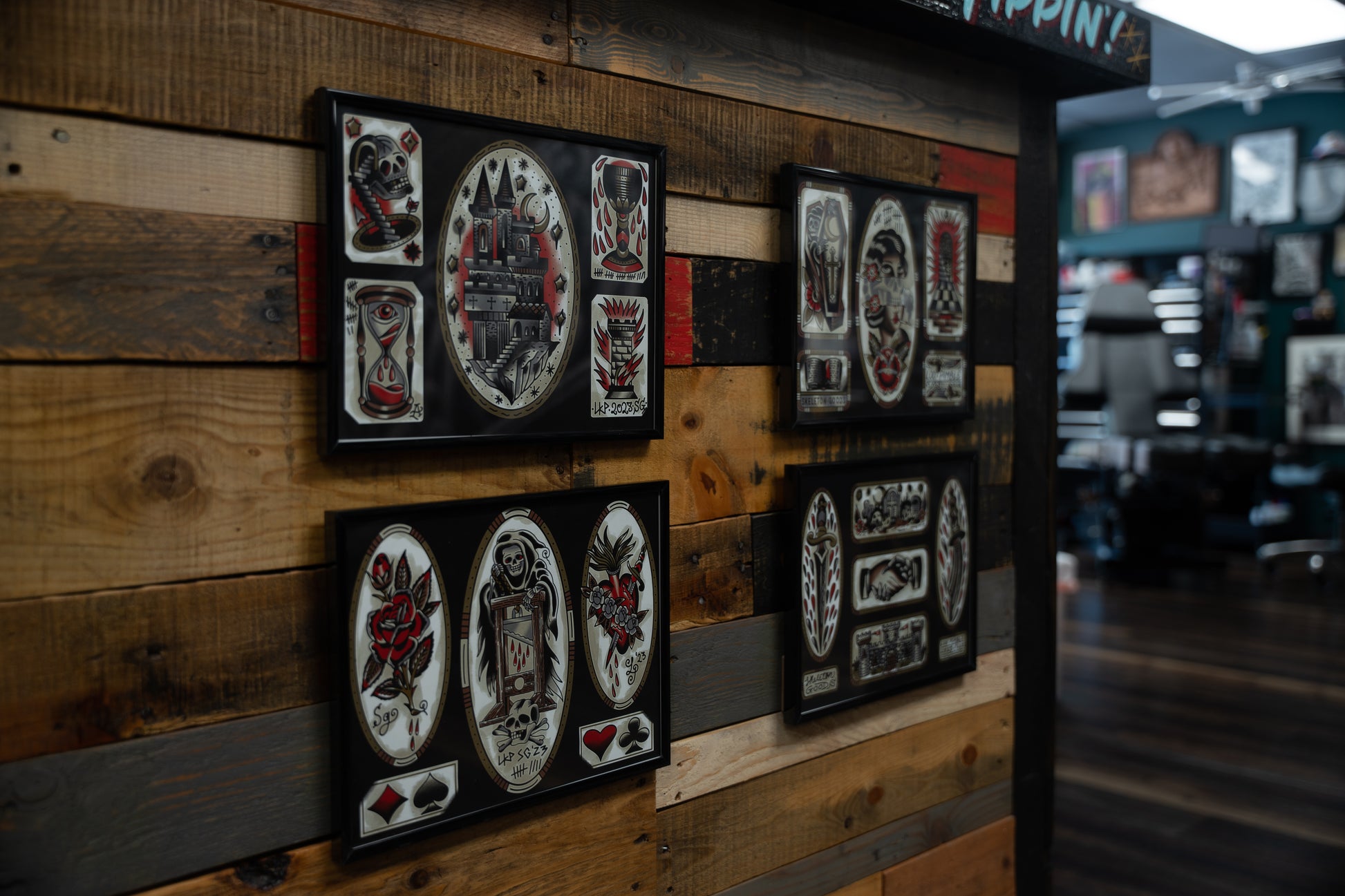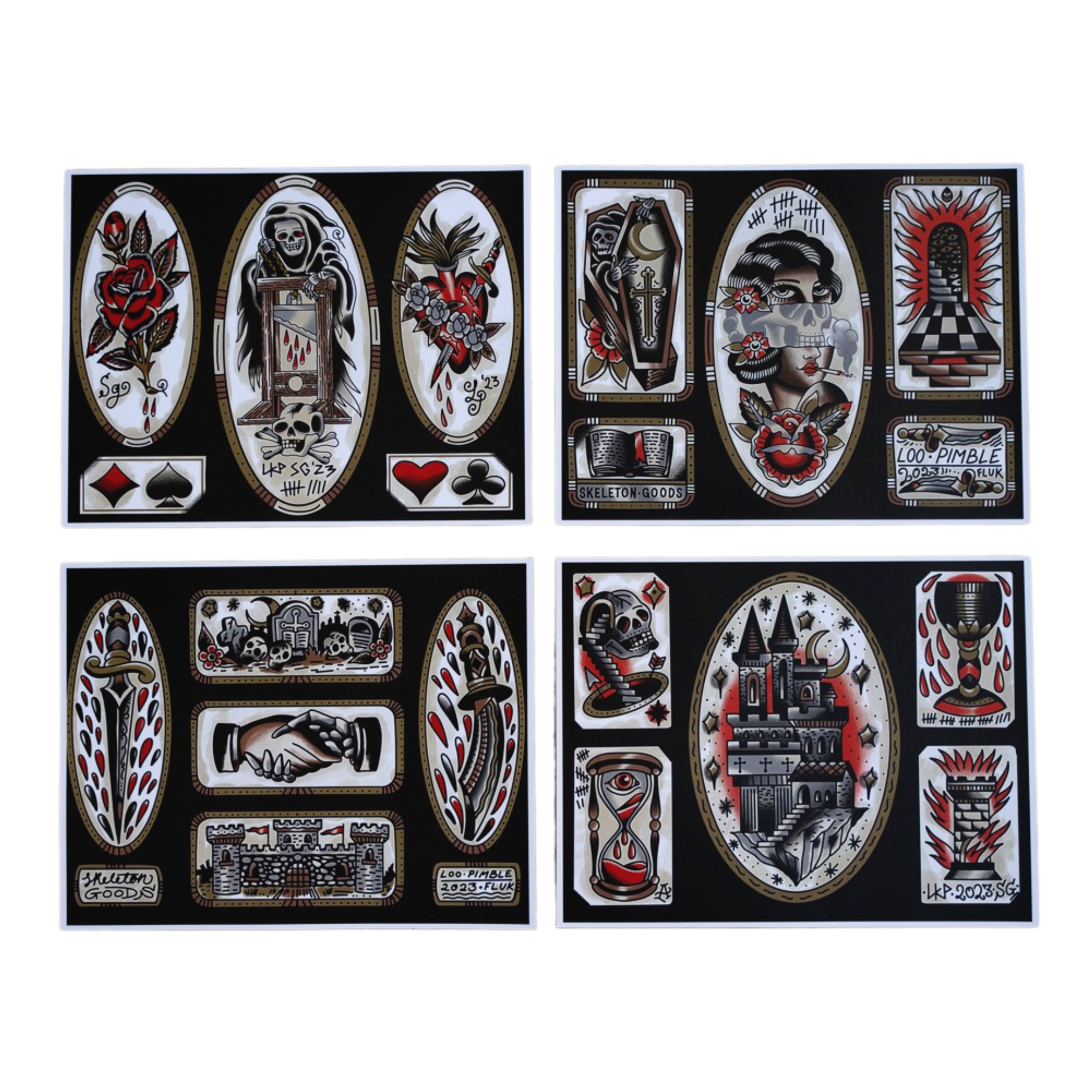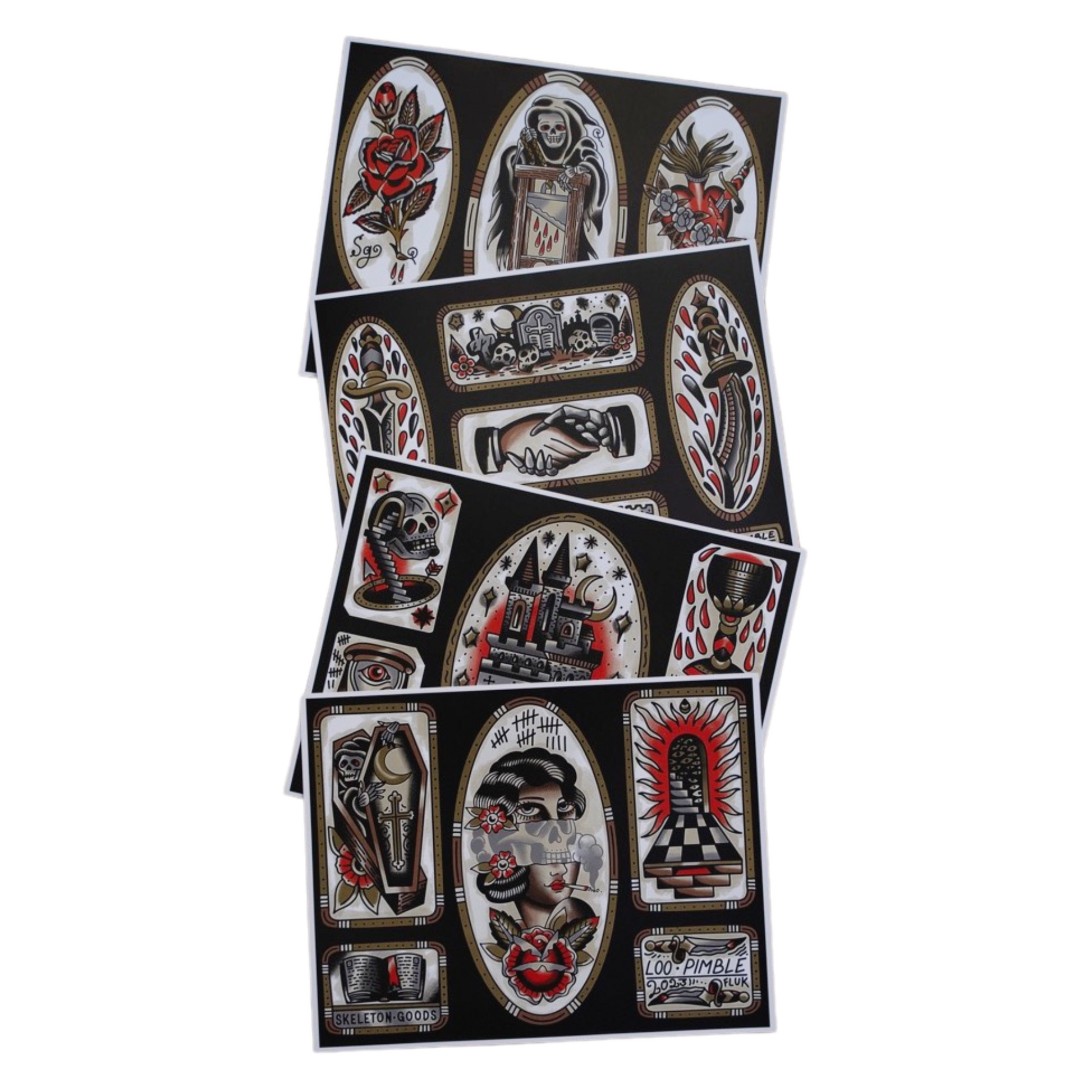 Step into the world of timeless American traditional tattoo art with our 4 Piece Flash Set of Death. Each vignette captures the essence of this iconic style, showcasing bold imagery and unique detailing. From daggers to grim reapers, each piece exudes a sense of dark allure and timeless charm.