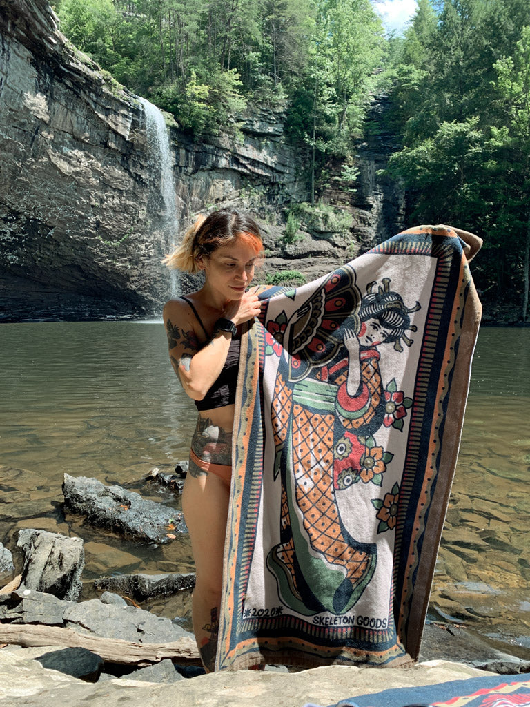 Wrap up in luxury with our exceptional beach towels! This is not your average towel, with its stunning traditional tattoo design and unparalleled softness. Our towels have been intentionally selected for their plushness, providing the perfect fluffiness to dry off and cozy up on your day by the water!