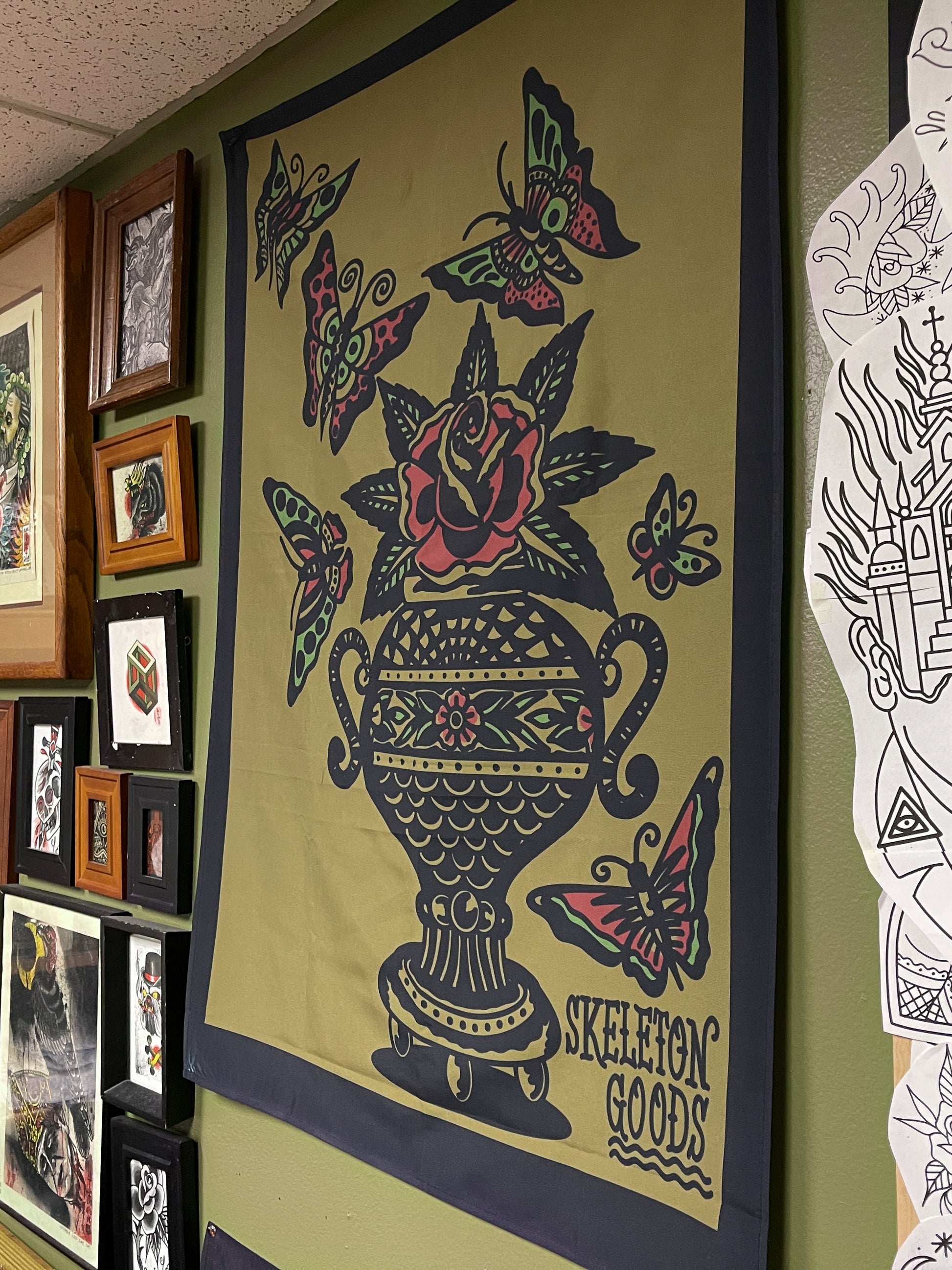 Our premium banners command attention! Designed with a keen eye for detail, our banners offer unparalleled quality and durability, ensuring they stand the test of time in any setting. All designs are created by the tattooer and Owner of Skeleton Goods, @loopimble.