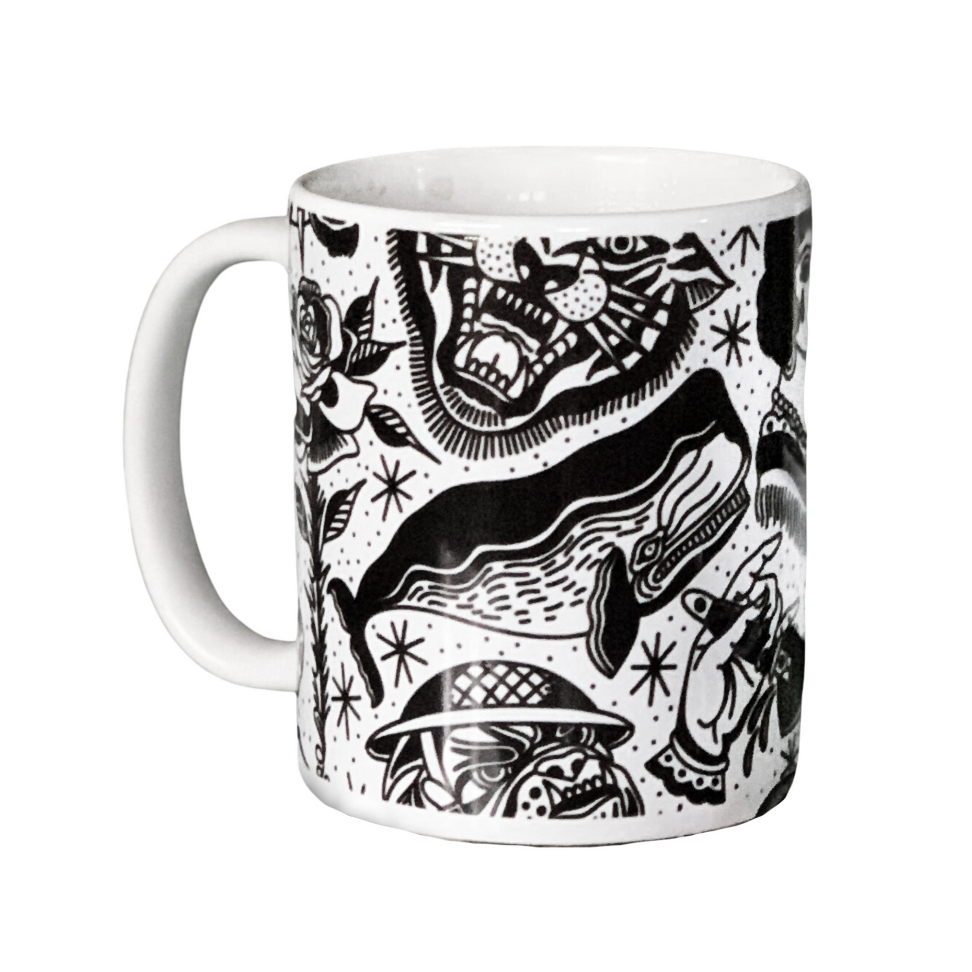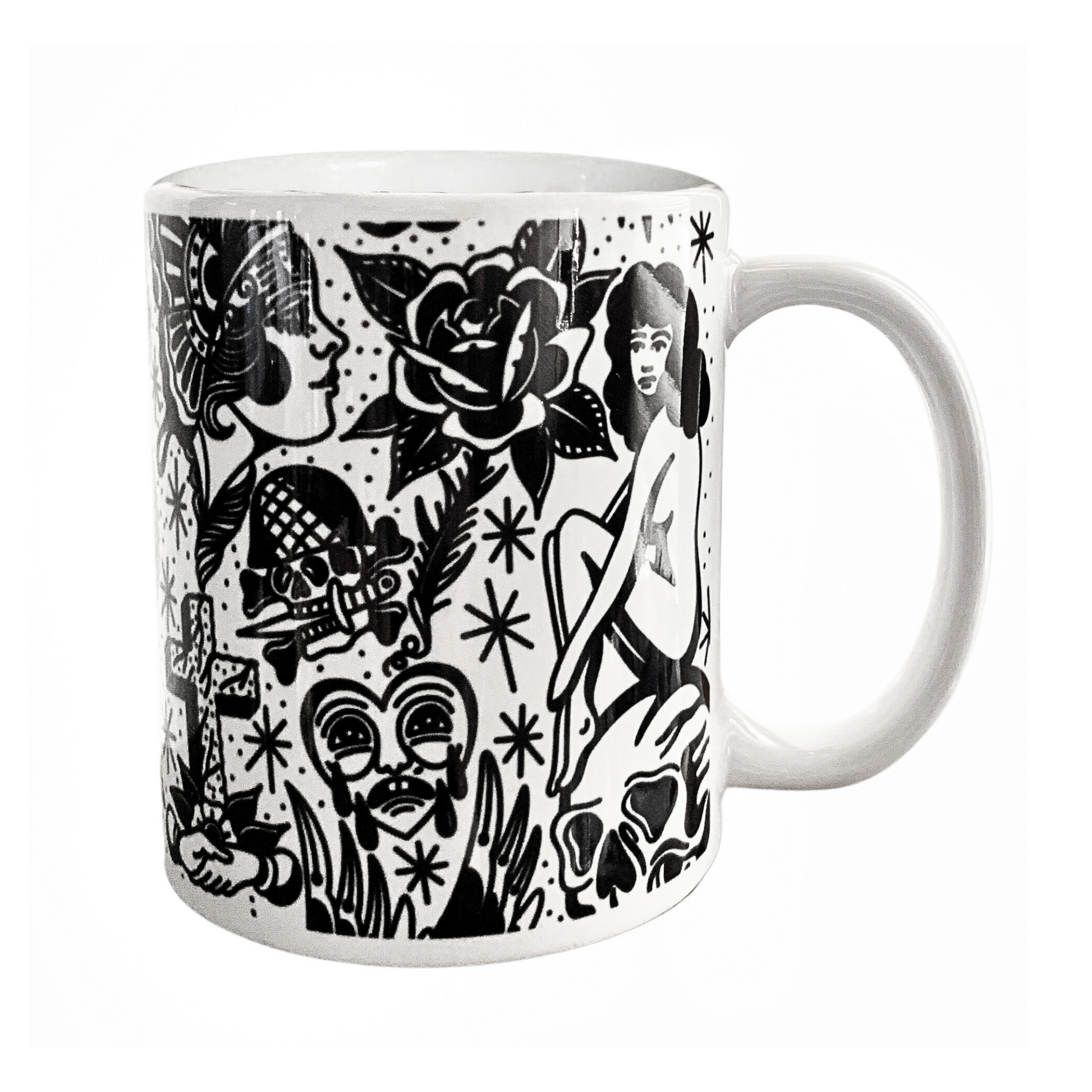 Our exquisitely crafted mugs are the epitome of style and functionality. Its generous capacity ensures ample room for your favorite hot beverages, while the ergonomic handle provides a comfortable grip for effortless enjoyment. Elevate your drinking experience and add a touch of personal tattoo style to your kitchen with this all over Black & White Flash design!