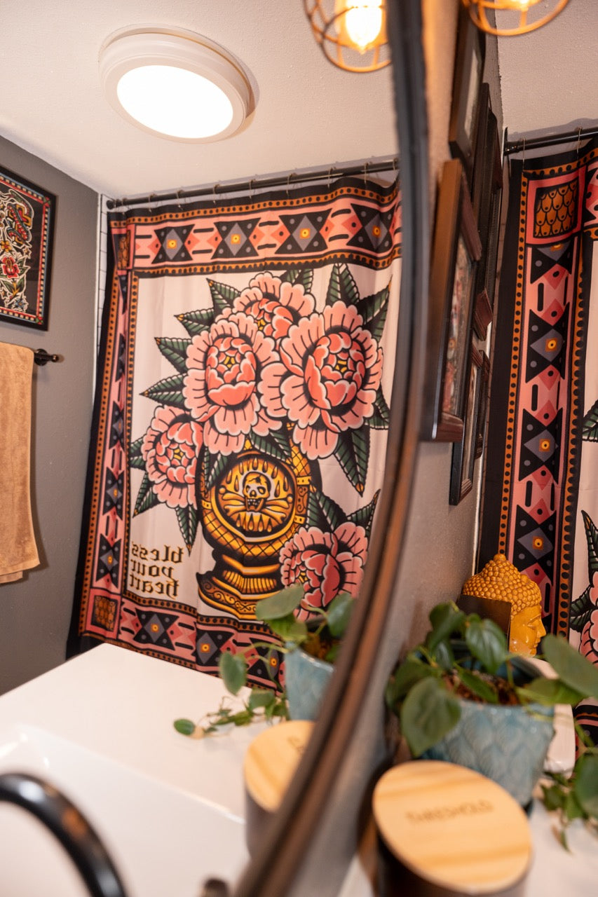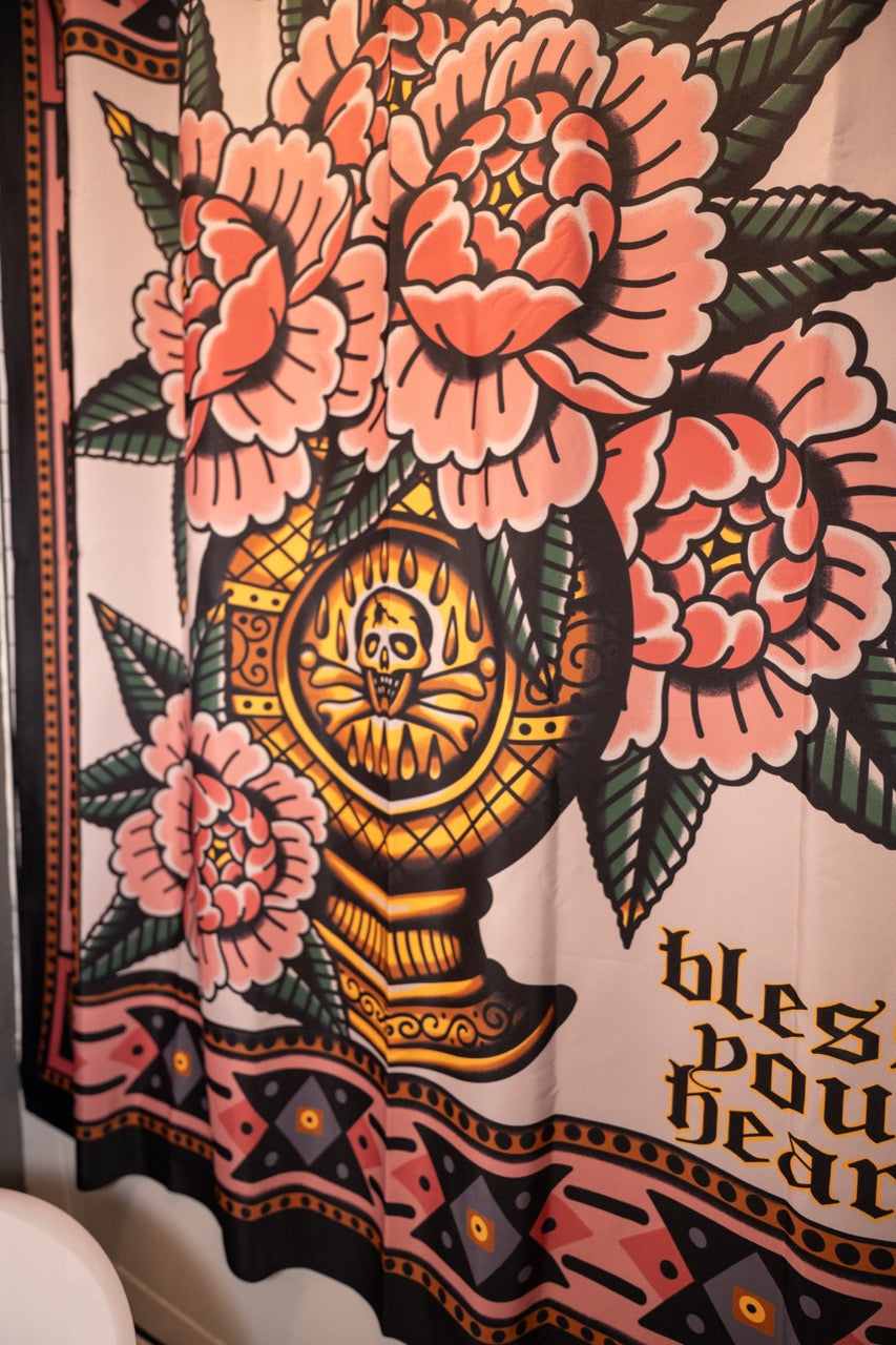 Crafted from high-quality, water-resistant material, this shower curtain adds a bit of edge and color while ensuring practical functionality. Its traditional tattoo peony design features intricate detailing that instantly elevates the ambiance of your bathroom! Experience luxury and beauty in every shower with our stunning decorative shower curtain.