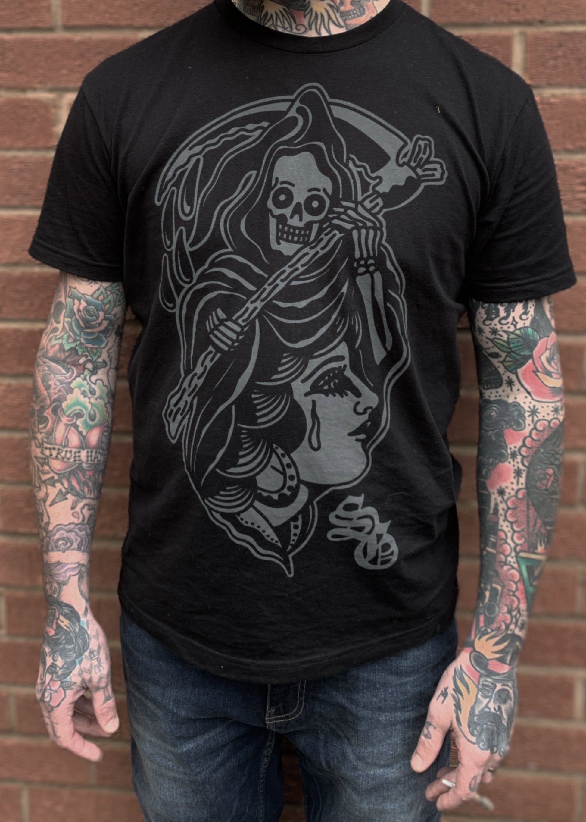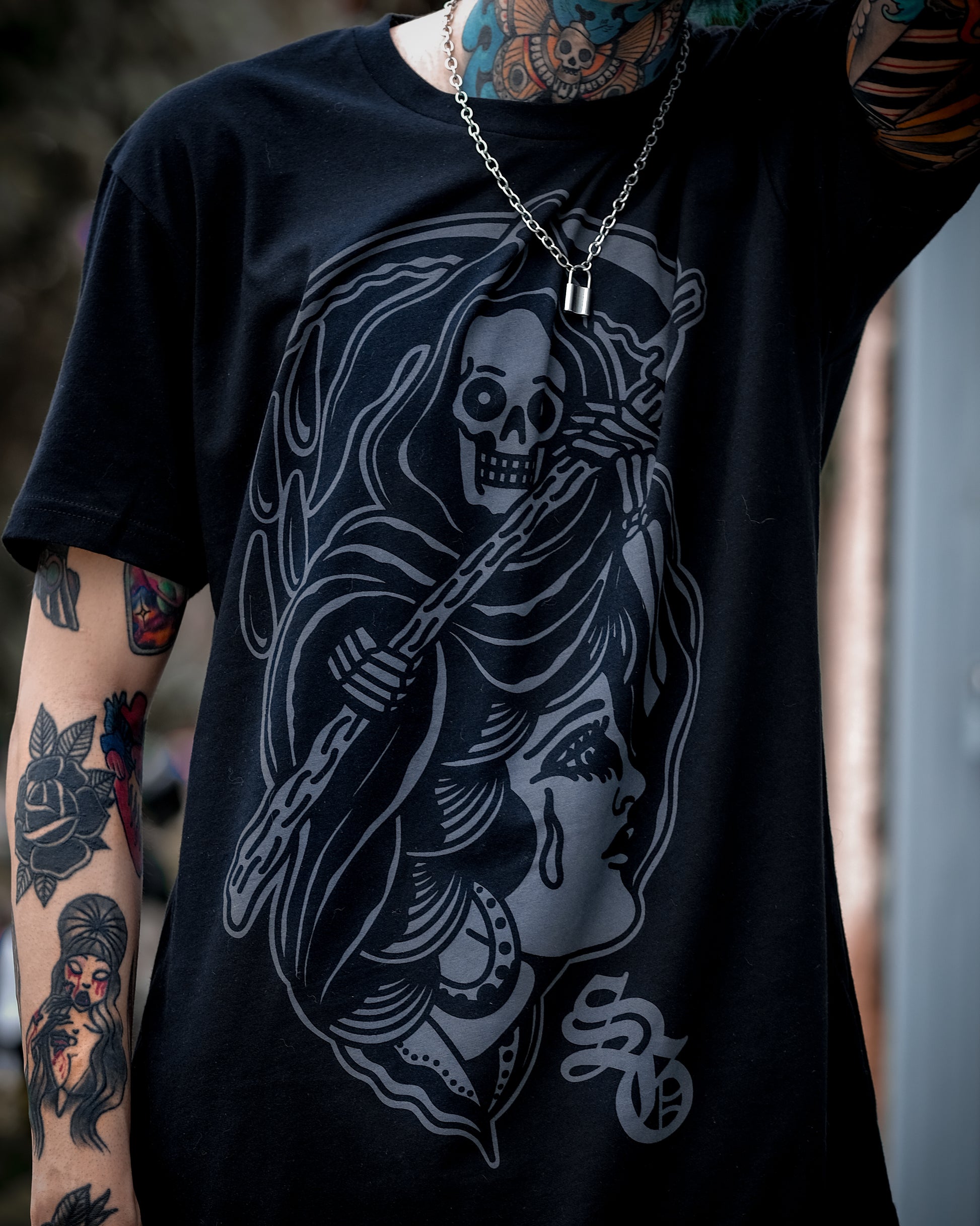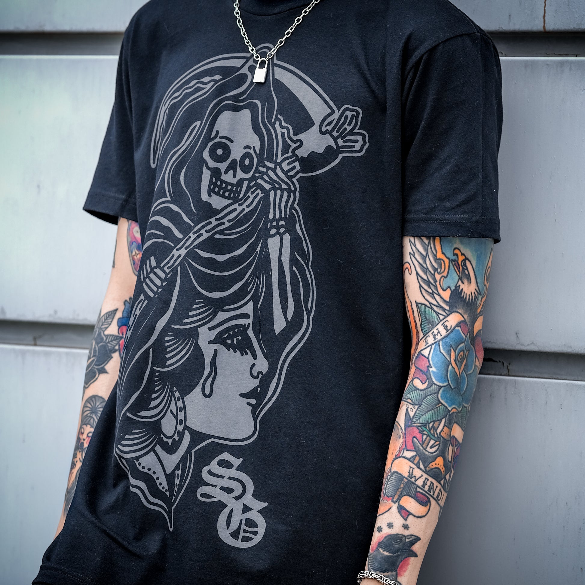 Our Reaper Girl shirt is one of the most captivating. Featuring a striking gray print on a soft, durable black fabric, this shirt is as comfortable as it is stylish! Making it the perfect addition to your wardrobe for a touch of traditional tattoo style.