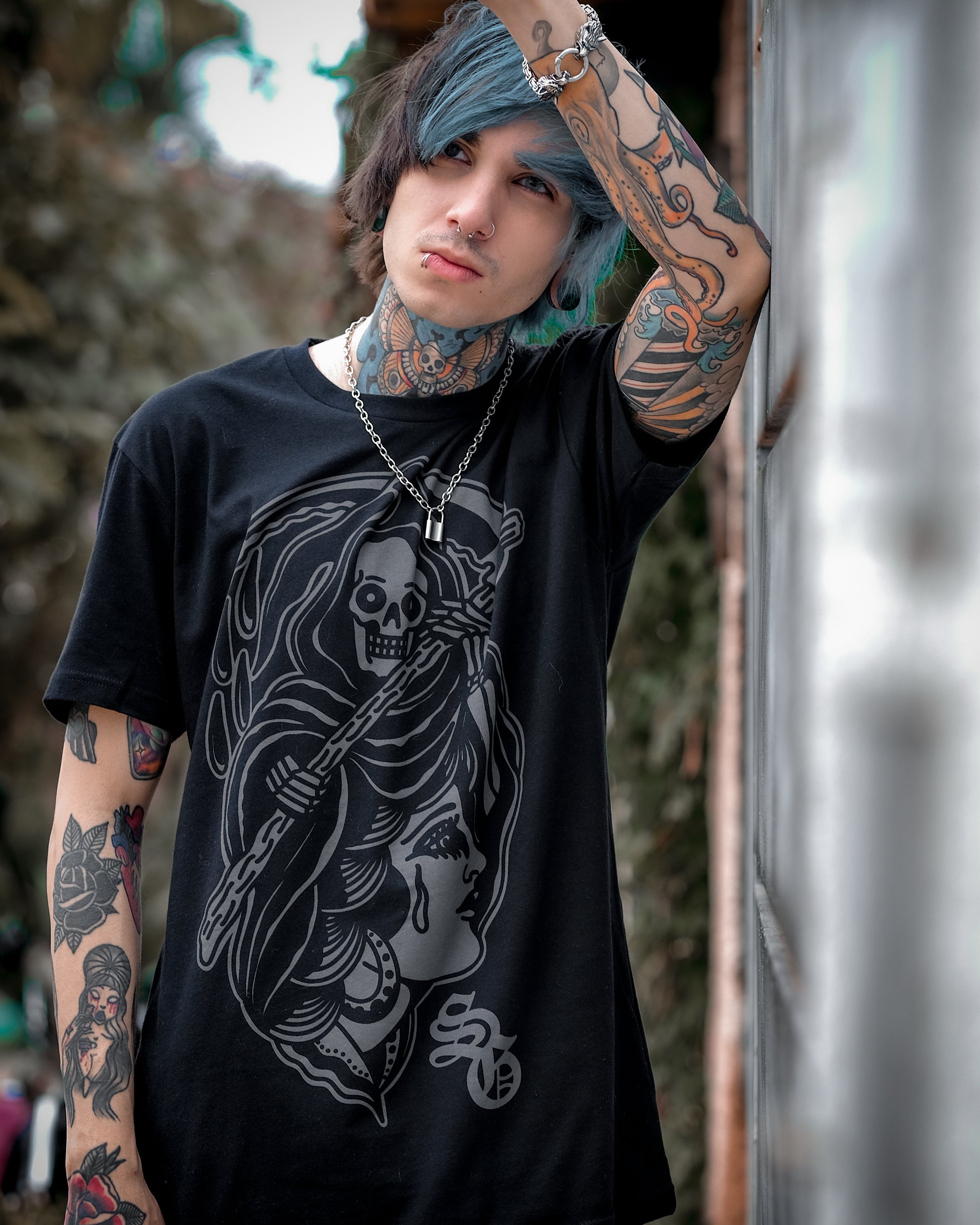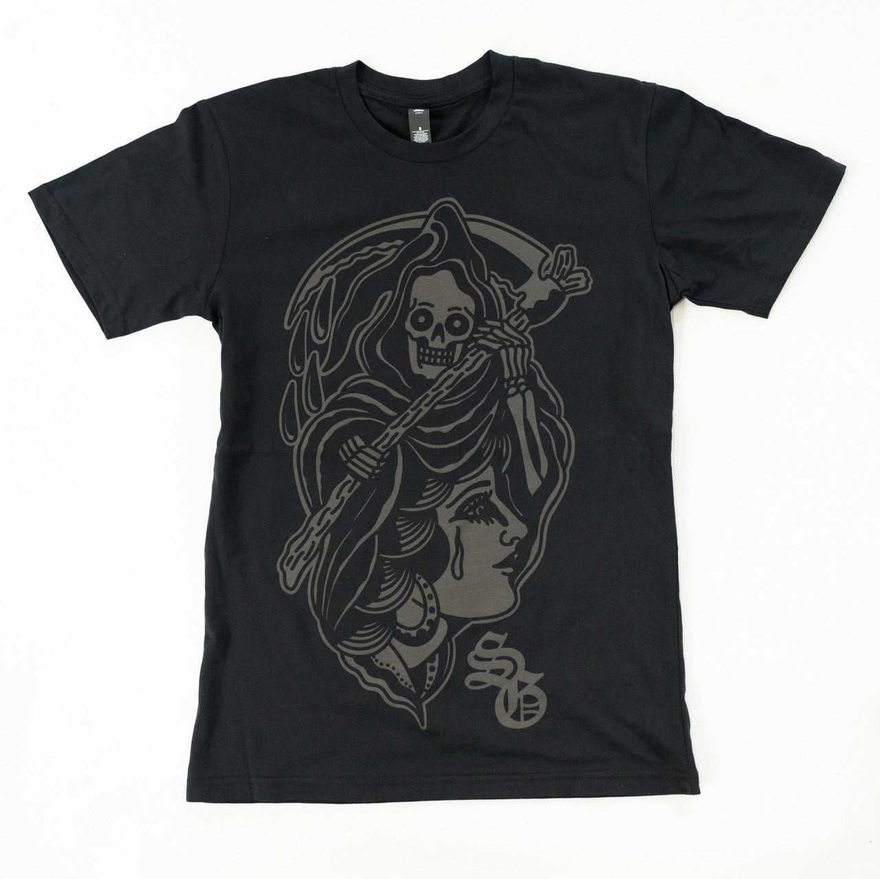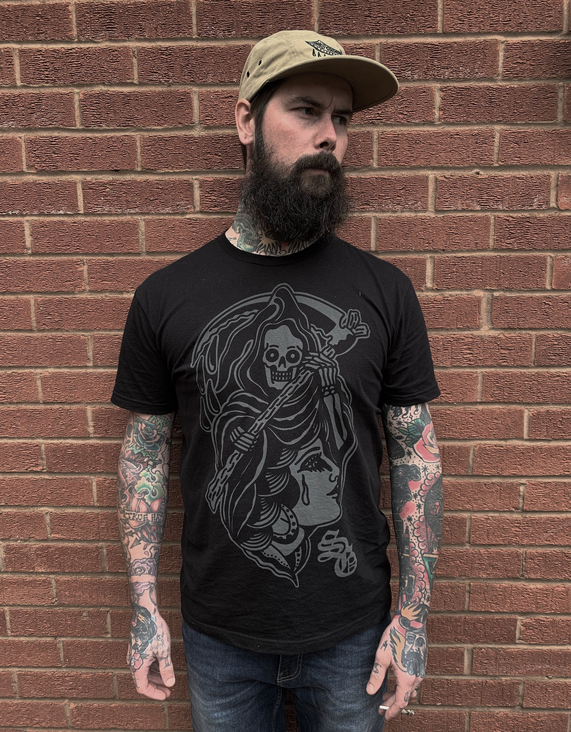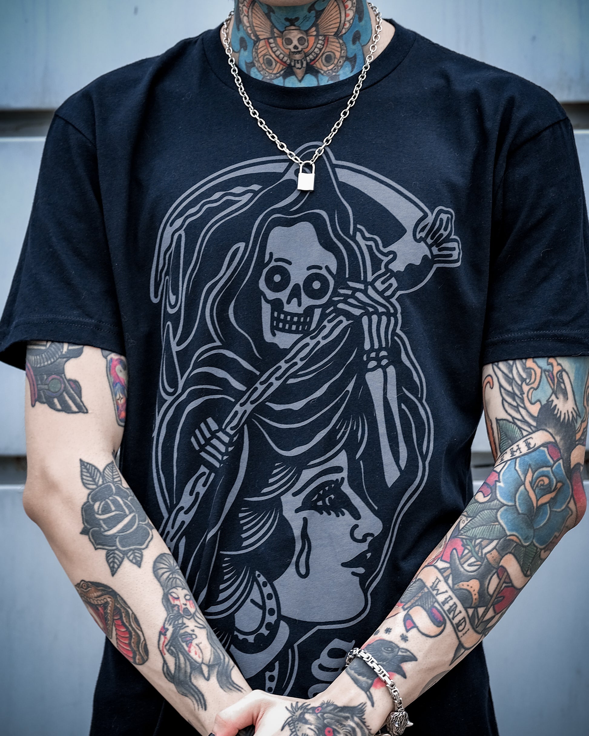 Our Reaper Girl shirt is one of the most captivating. Featuring a striking gray print on a soft, durable black fabric, this shirt is as comfortable as it is stylish! Making it the perfect addition to your wardrobe for a touch of traditional tattoo style.