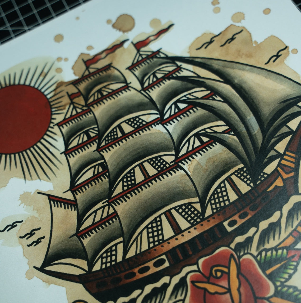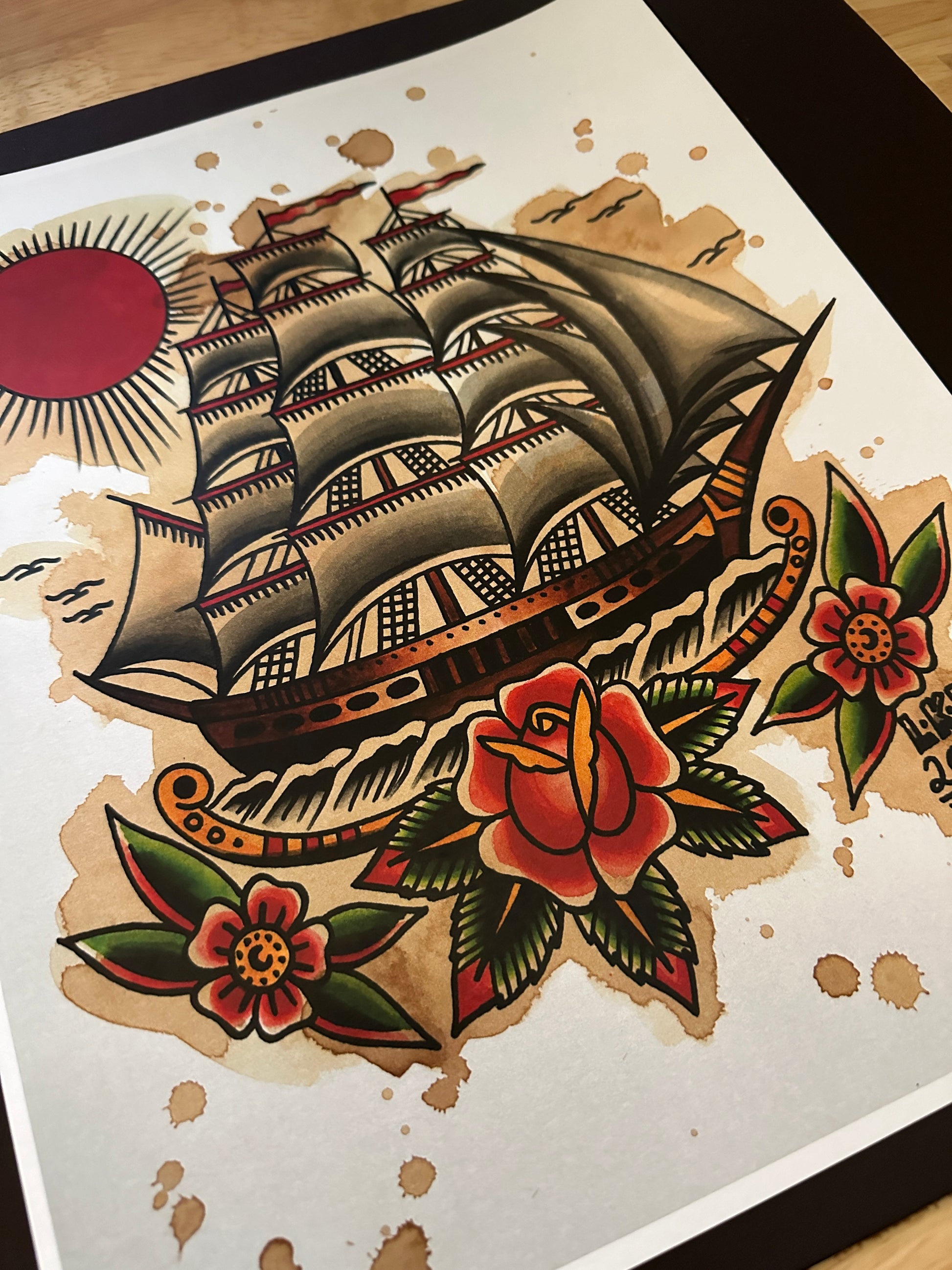 Vintage colored paper enriched with intricate color details transform a basic pinup into an extraordinary piece of flash art! All designs are created by the tattooer and Owner of Skeleton Goods, @loopimble.