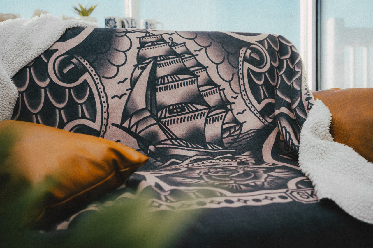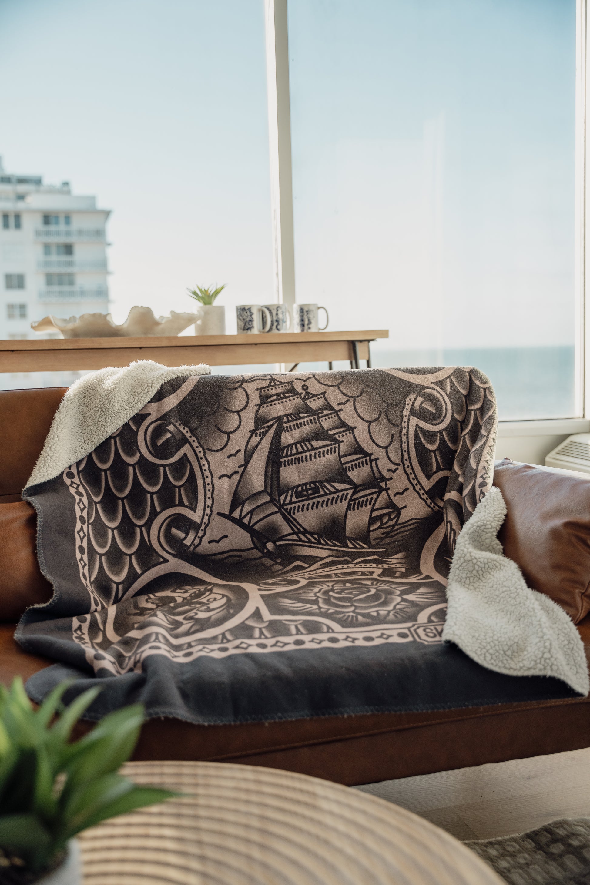 Wrap yourself in warmth and timeless style with our Sherpa-Lined Fleece Blanket! Featuring several nautical designs, this blanket brings a touch of vintage charm and personality to your home decor. Whether you're cuddled up on the couch or adding a unique accent to your bedroom, our Sherpa-Lined Fleece Blanket is sure to delight both tattoo enthusiasts and cozy comfort seekers alike.