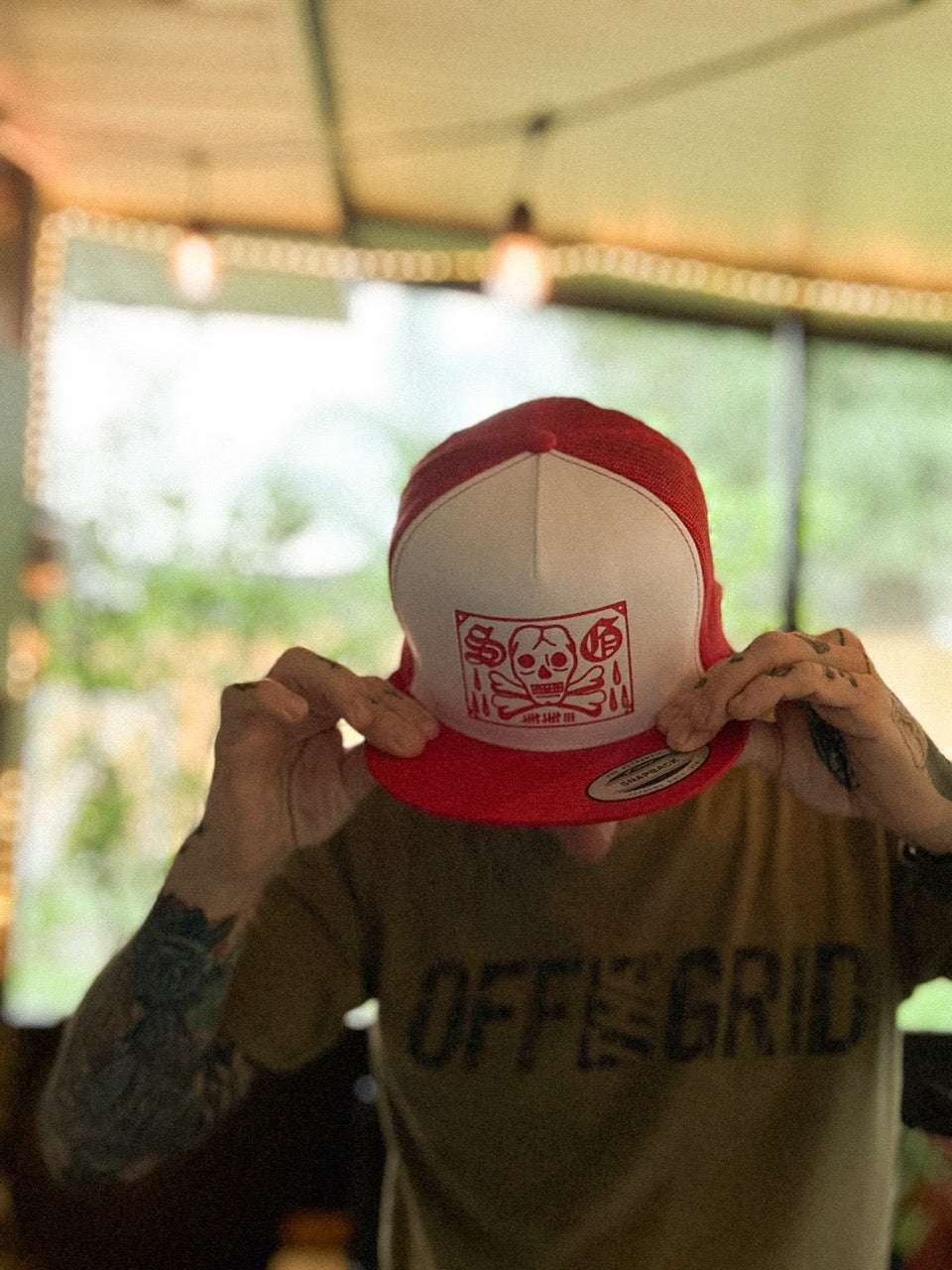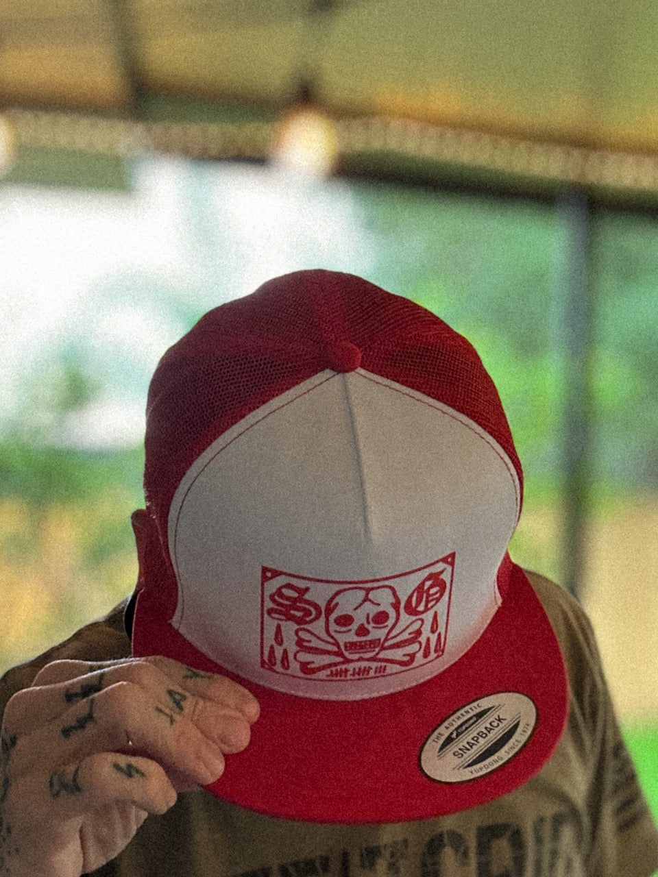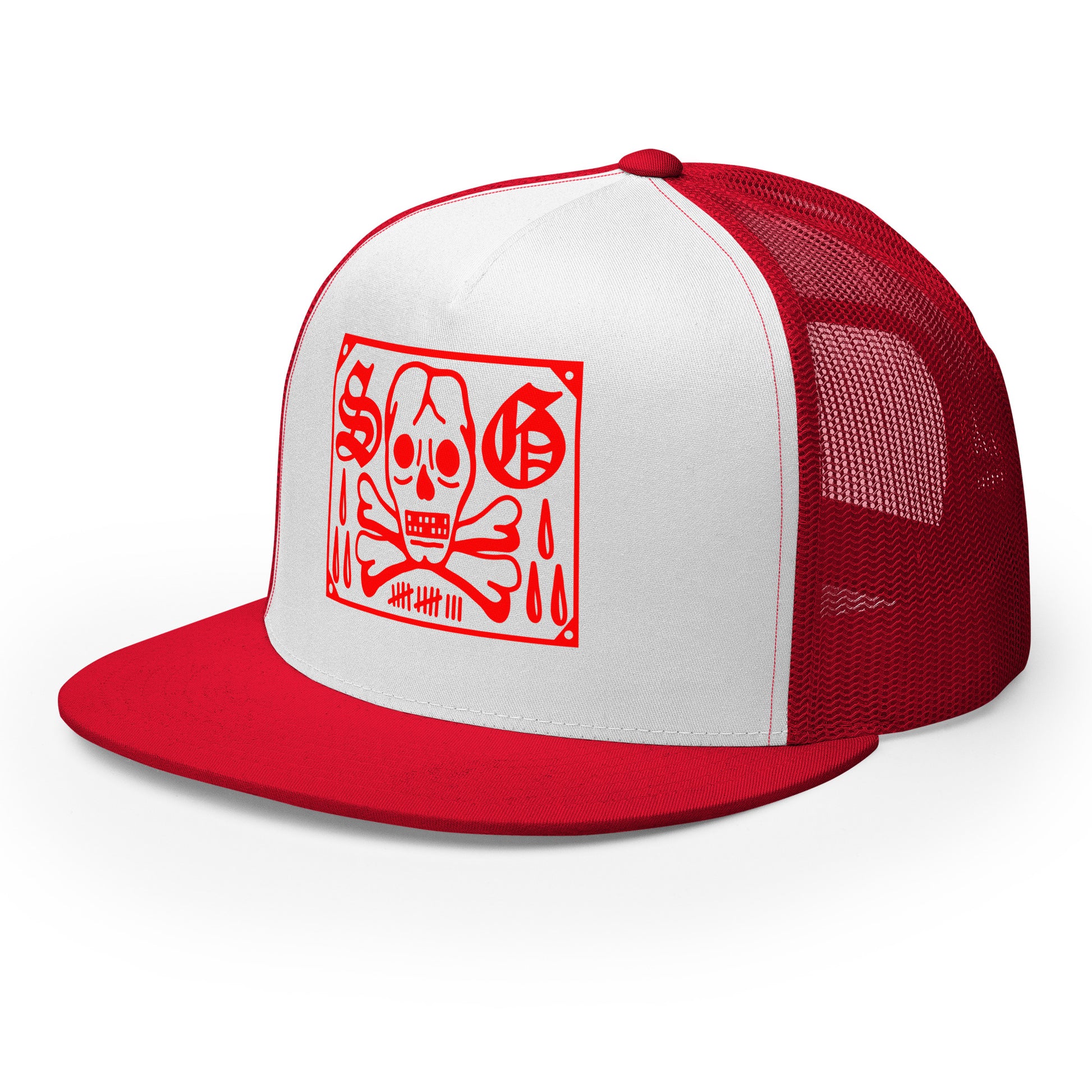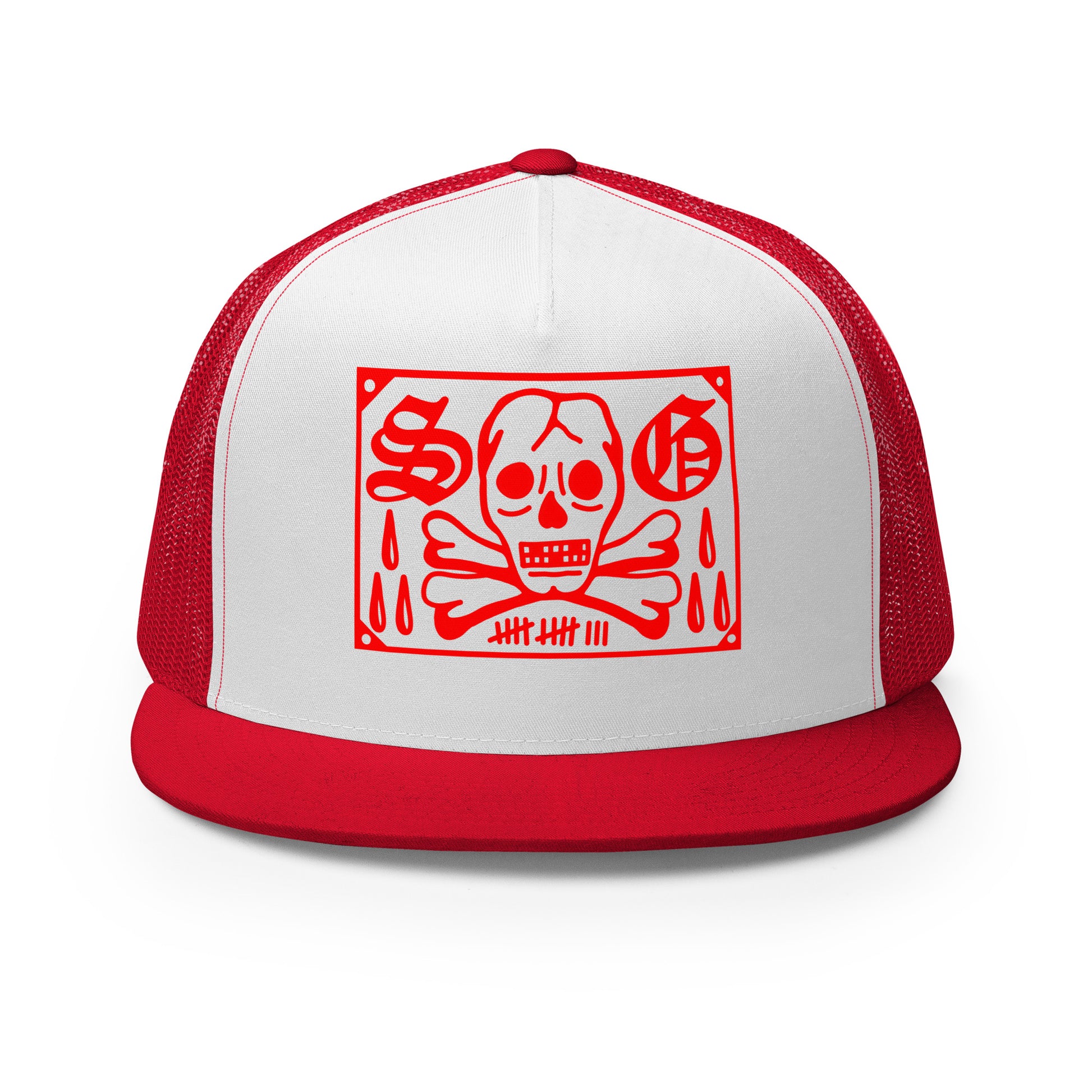 Experience the timeless trucker hat style with a unique design on a durable fabric. This hat style stands as one of our personal favorites, boasting a perfect balance — not too tall, but just right. Our design showcases a bold skull design in striking red print. Crafted with care, this hat is made from high-quality materials that ensure durability and comfort. The adjustable strap at the back allows for a customizable fit, making it suitable for all head sizes.