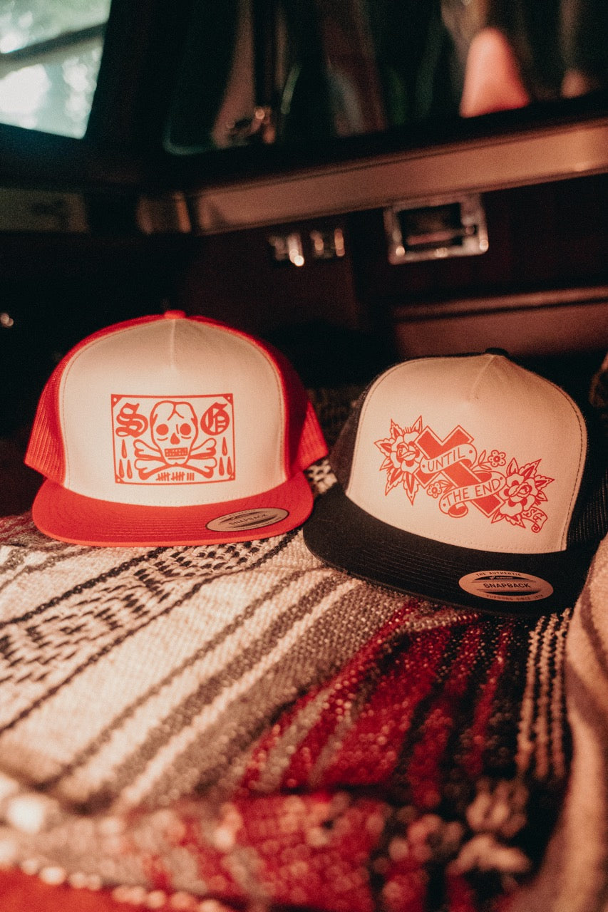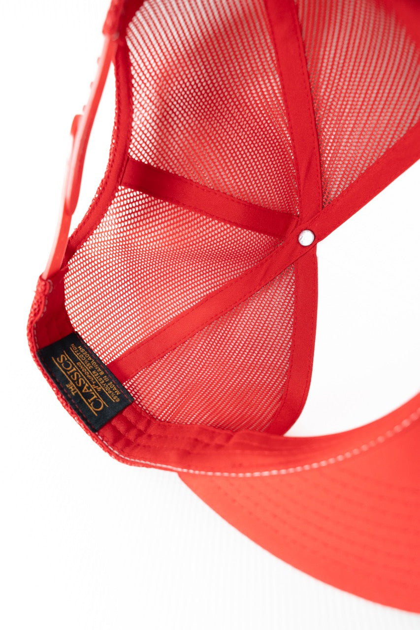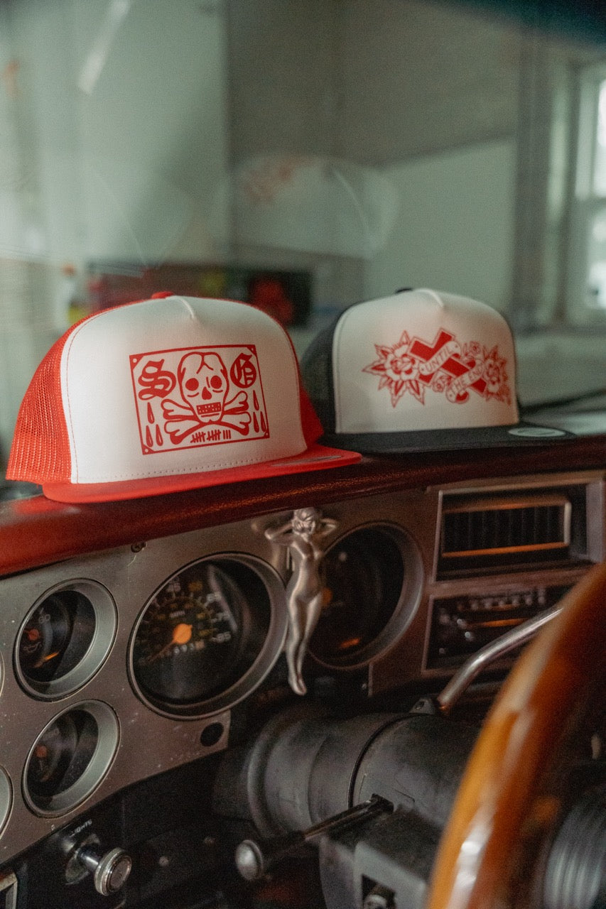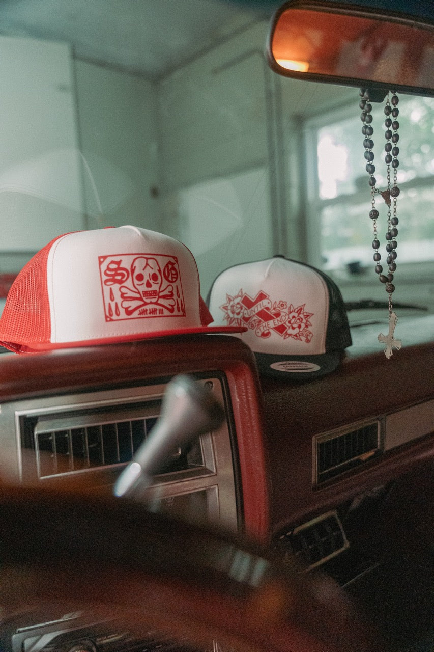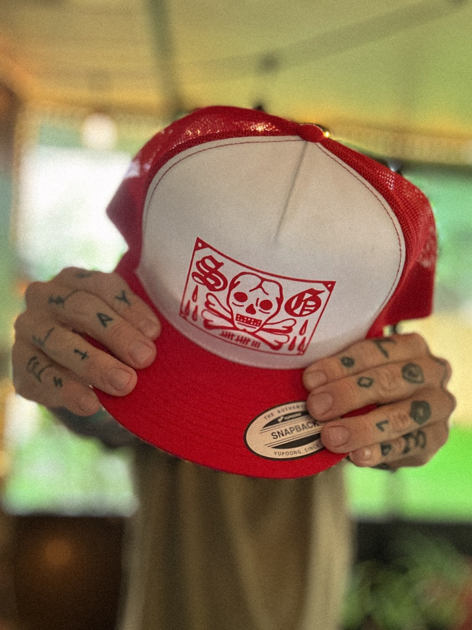 Experience the timeless trucker hat style with a unique design on a durable fabric. This hat style stands as one of our personal favorites, boasting a perfect balance — not too tall, but just right. Our design showcases a bold skull design in striking red print. Crafted with care, this hat is made from high-quality materials that ensure durability and comfort. The adjustable strap at the back allows for a customizable fit, making it suitable for all head sizes.