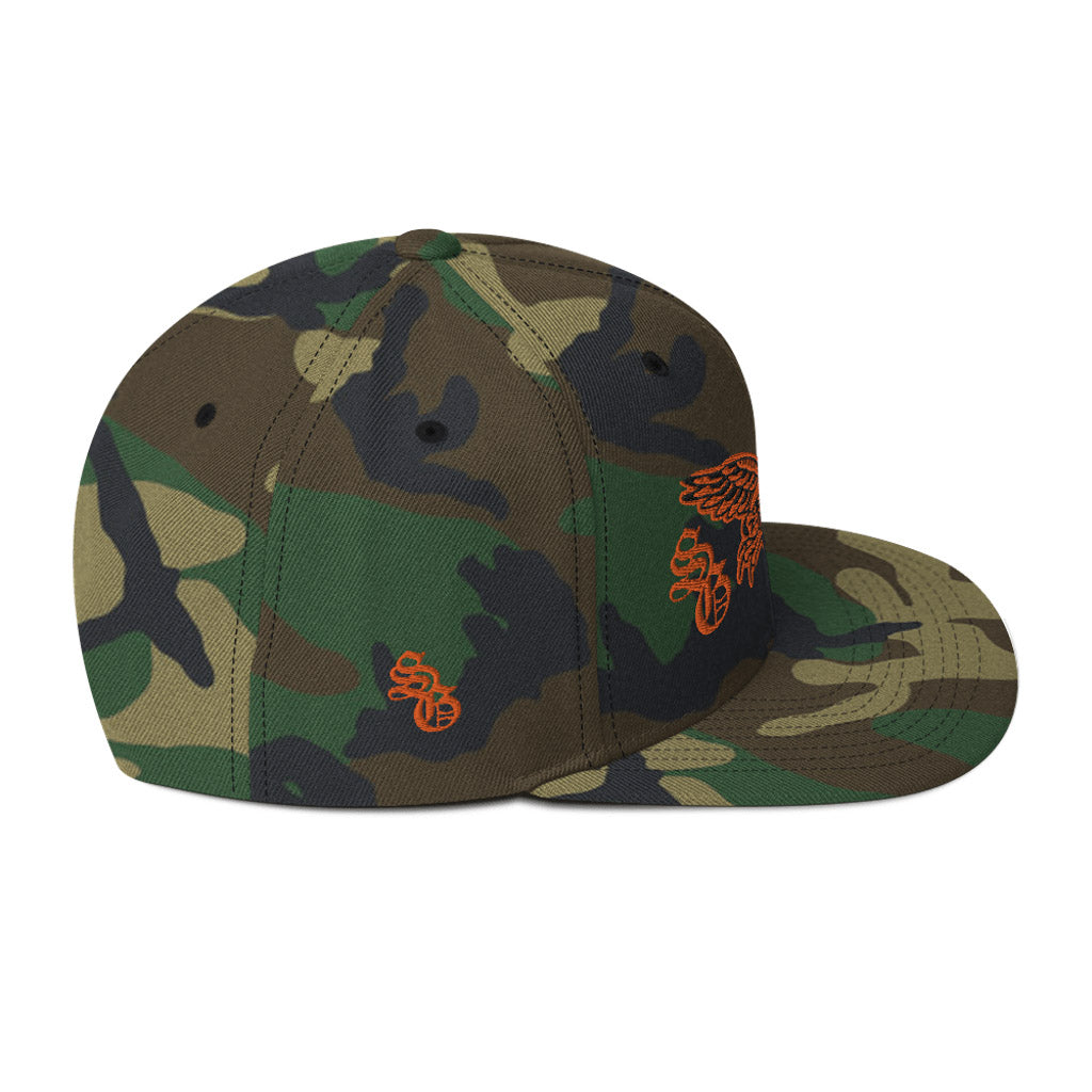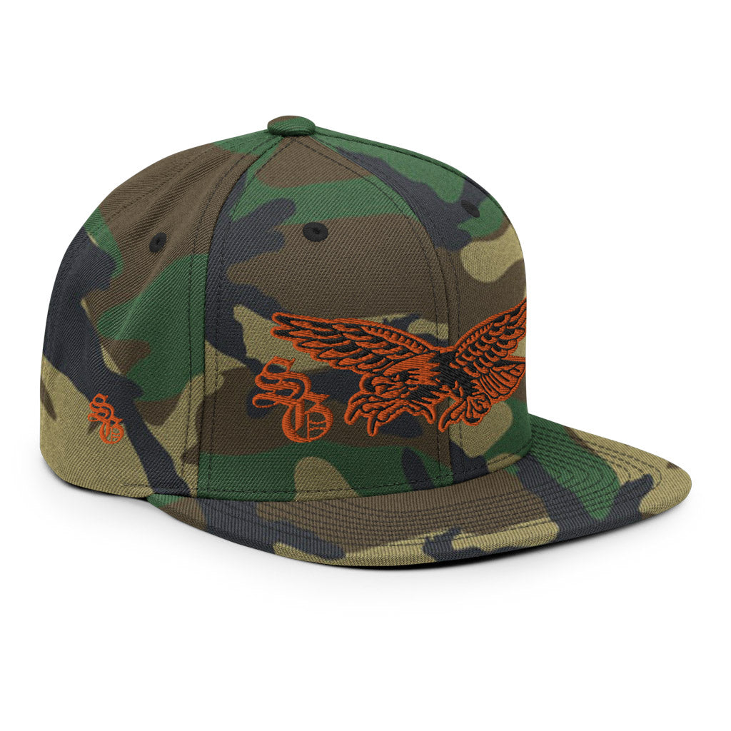 Experience the timeless snapback style with a unique camo twist. Our embroidery showcases a traditional tattoo Eagle design in striking black and orange thread.