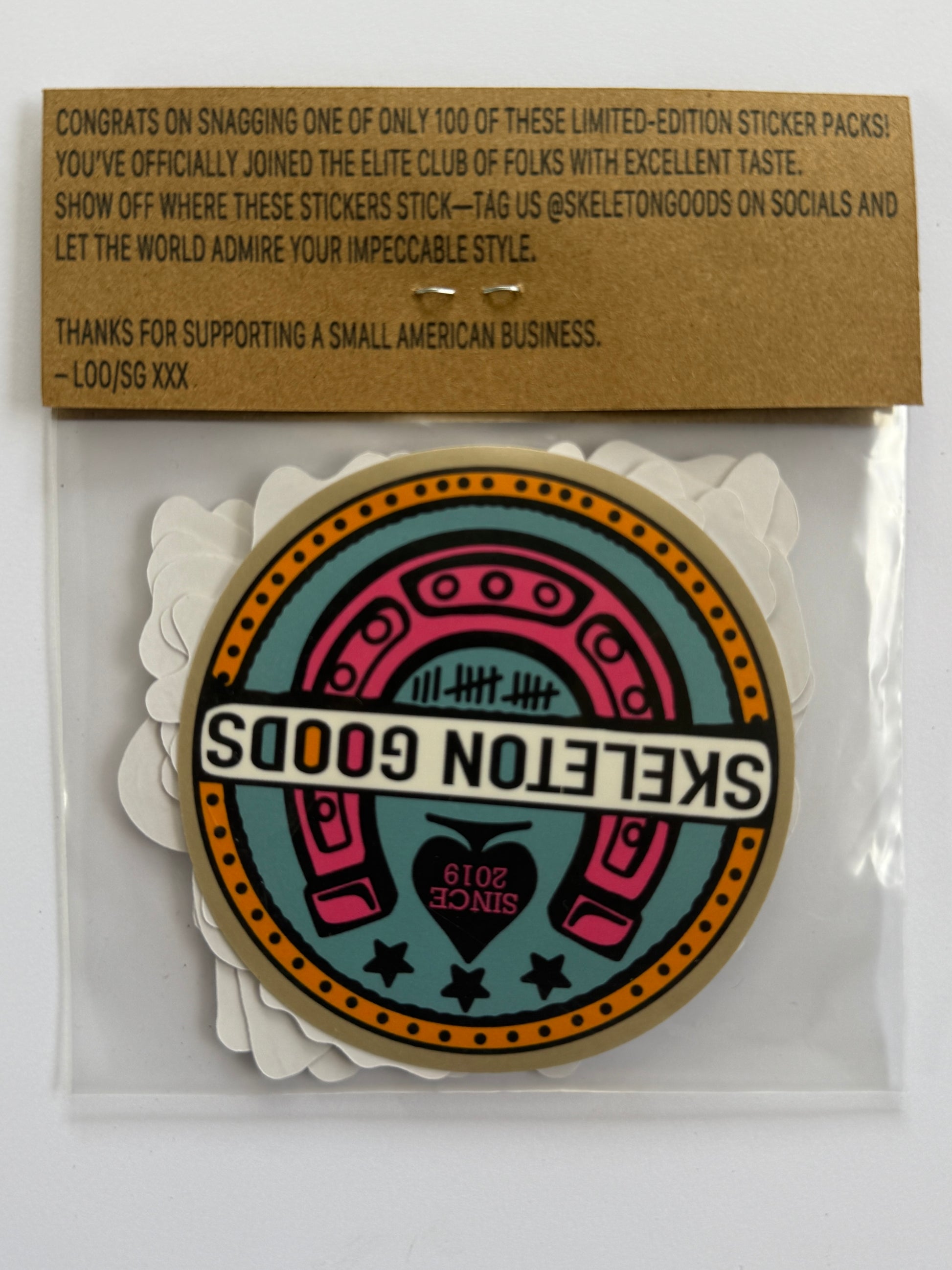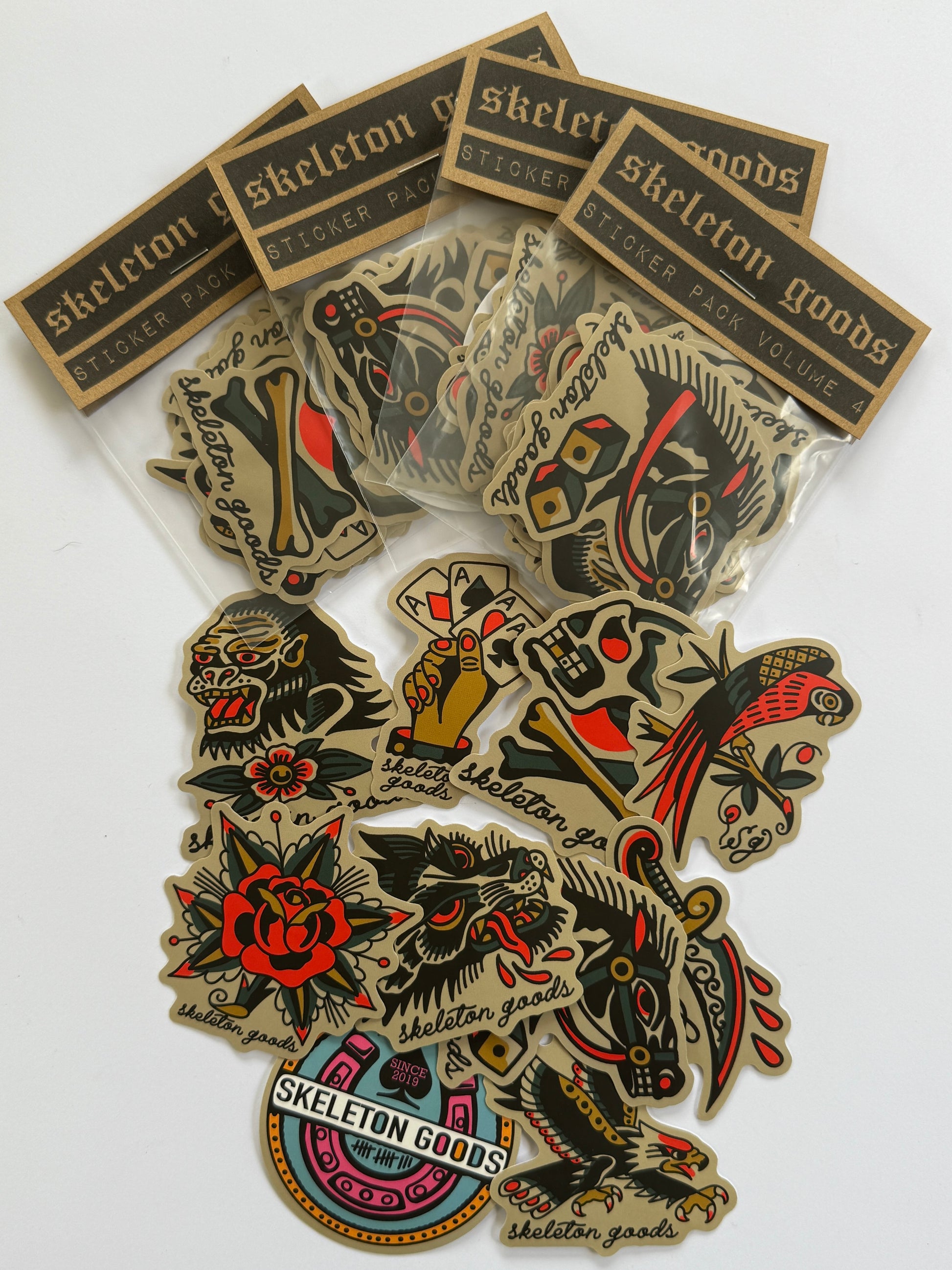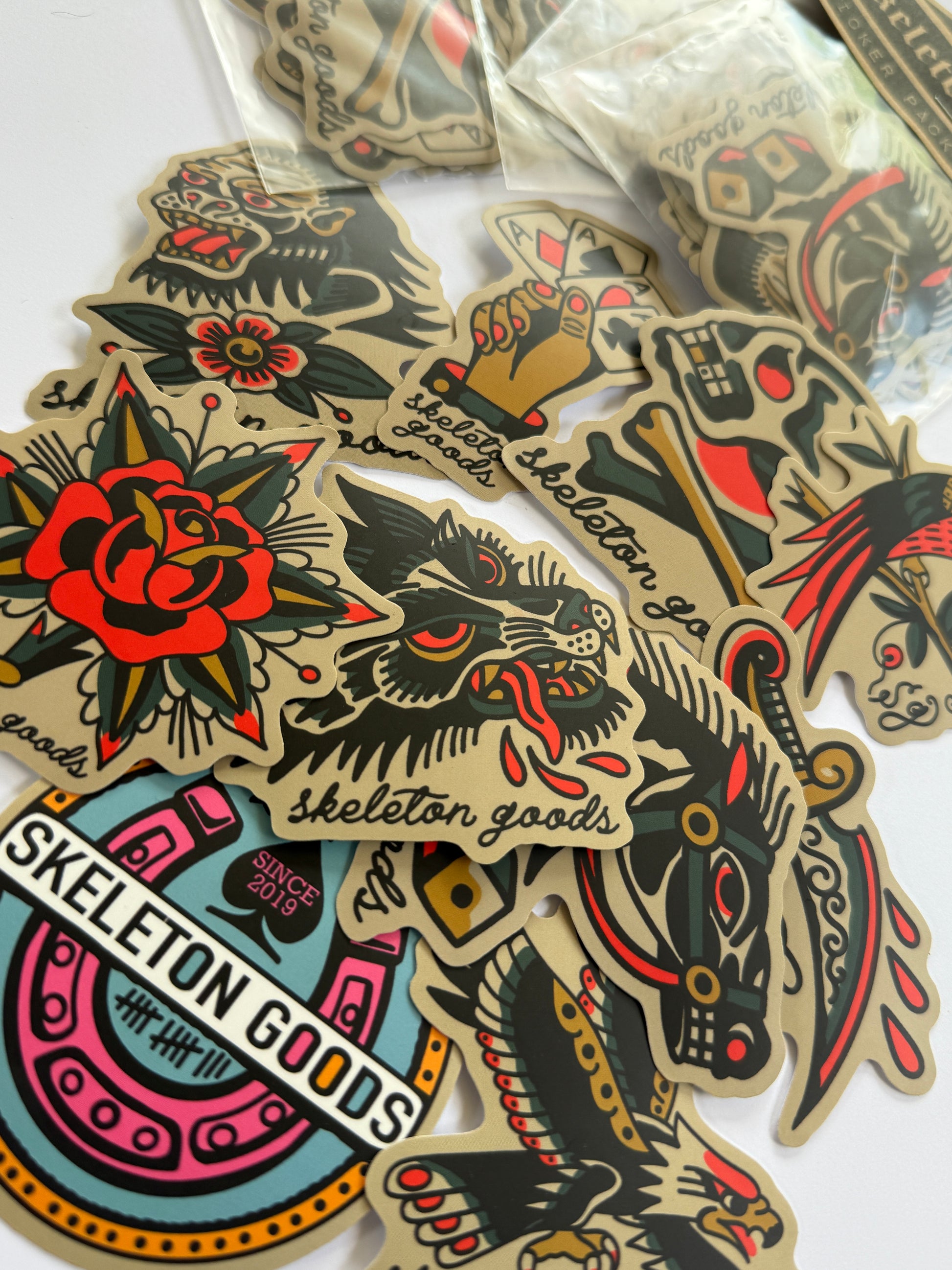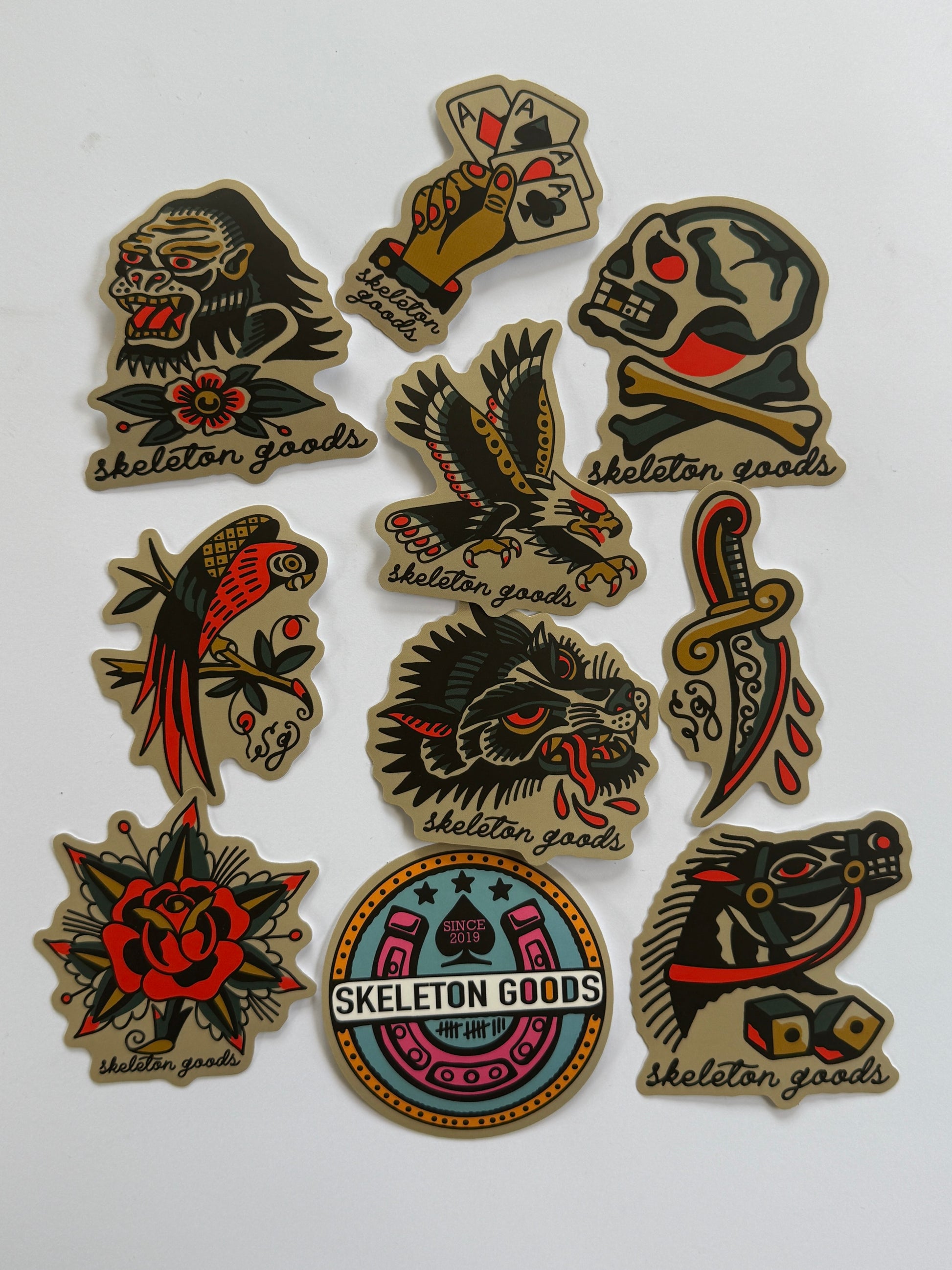 Vibrant and timeless, this 10-Pack of Skeleton Goods Stickers features an array of classic motifs! Each sticker in this set features a unique design inspired by traditional tattoo art. Perfect for adorning your laptop, car, notebook, water bottle, or any other surface, these stickers add a touch of personality and style wherever they're placed.