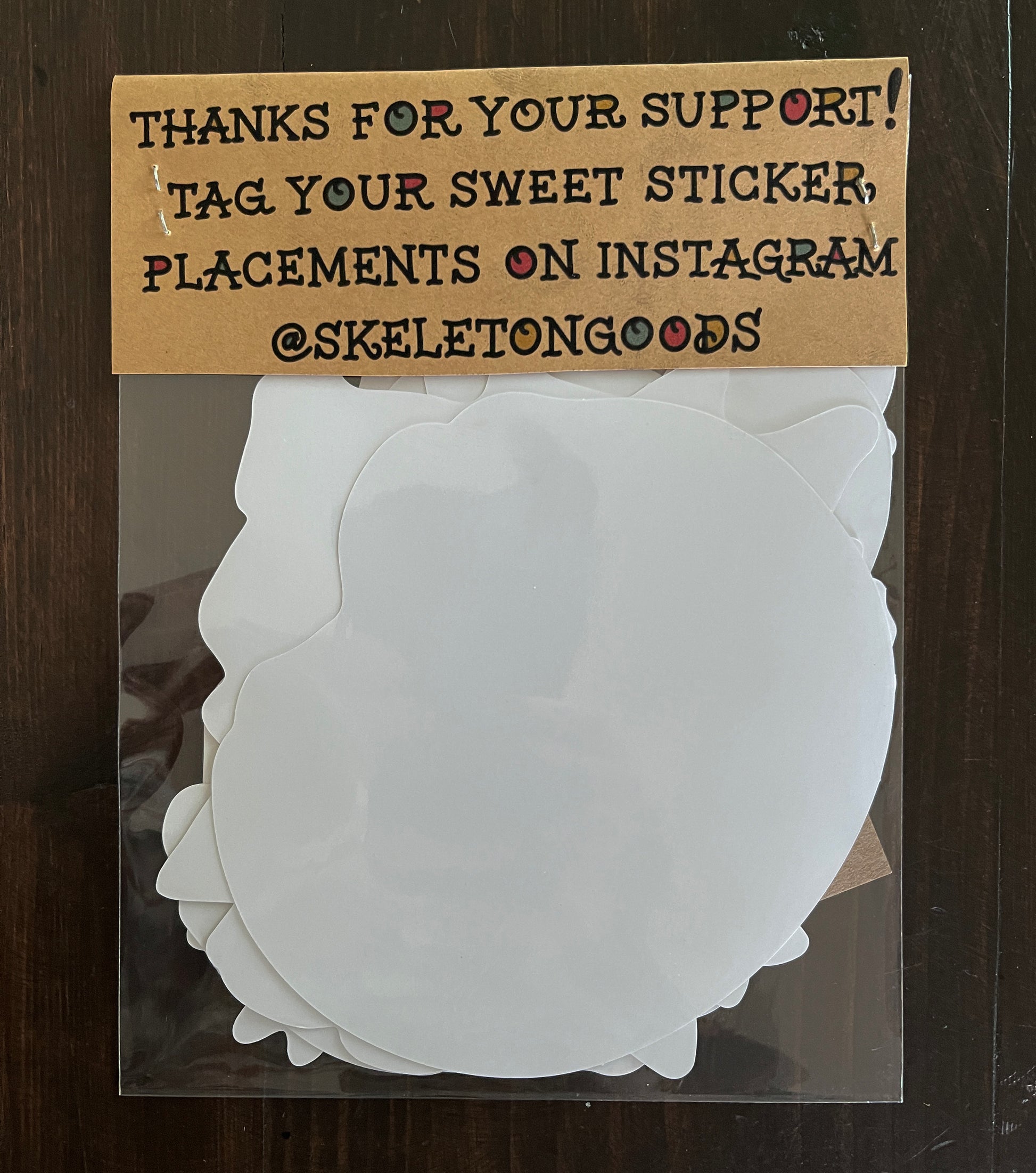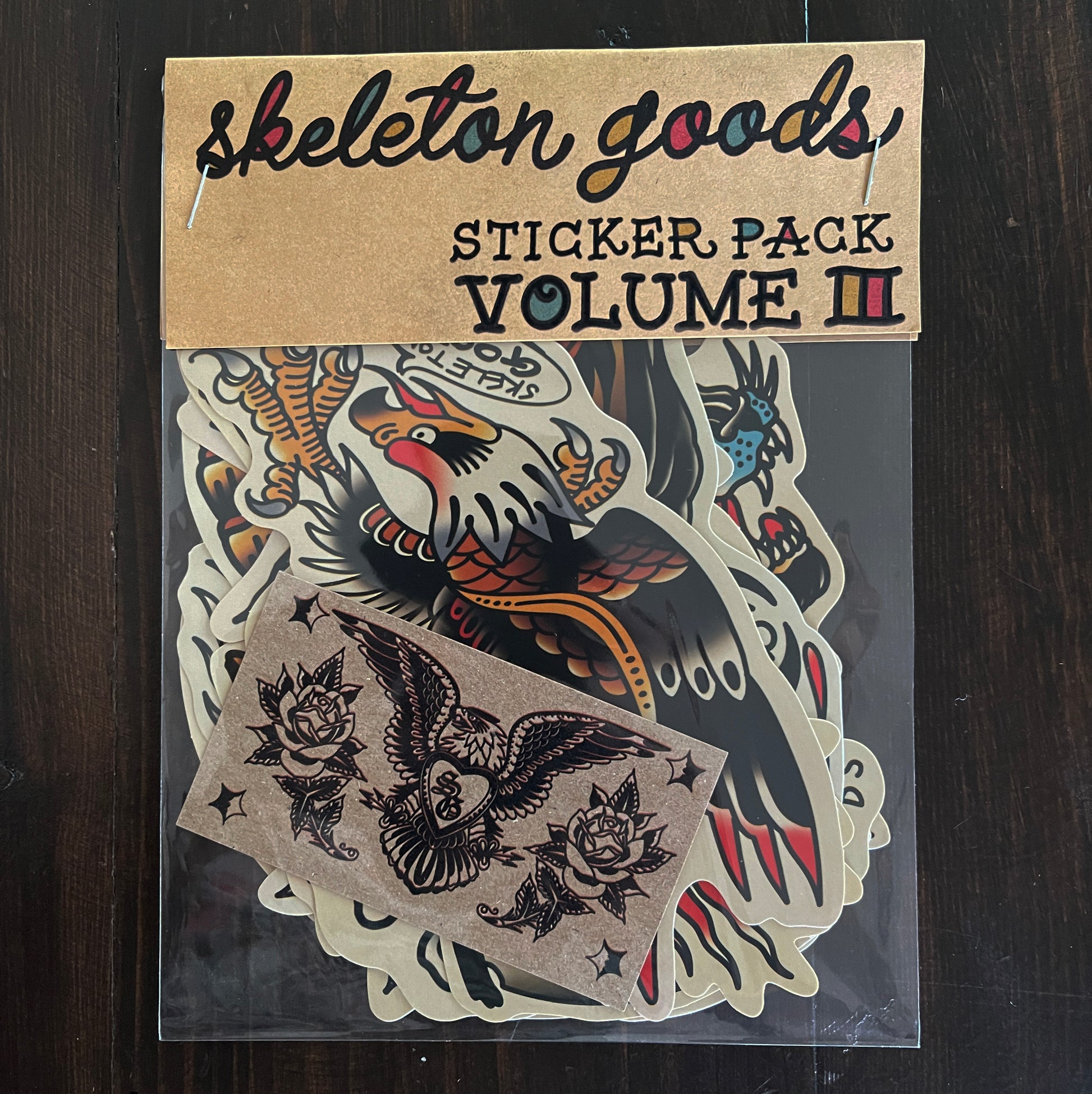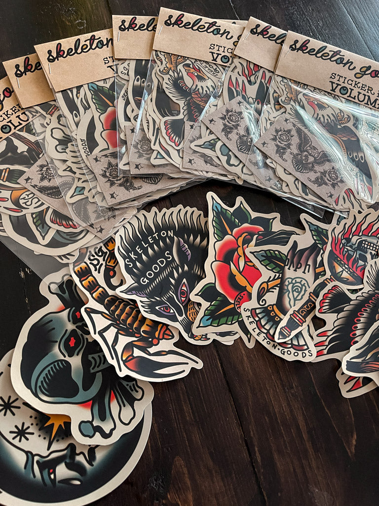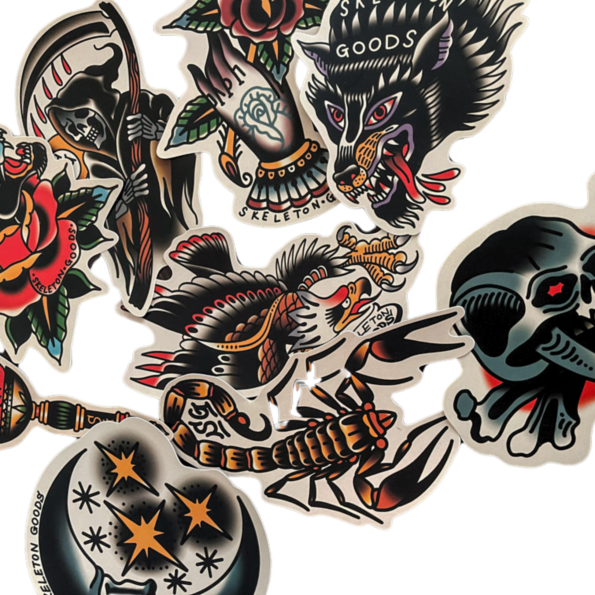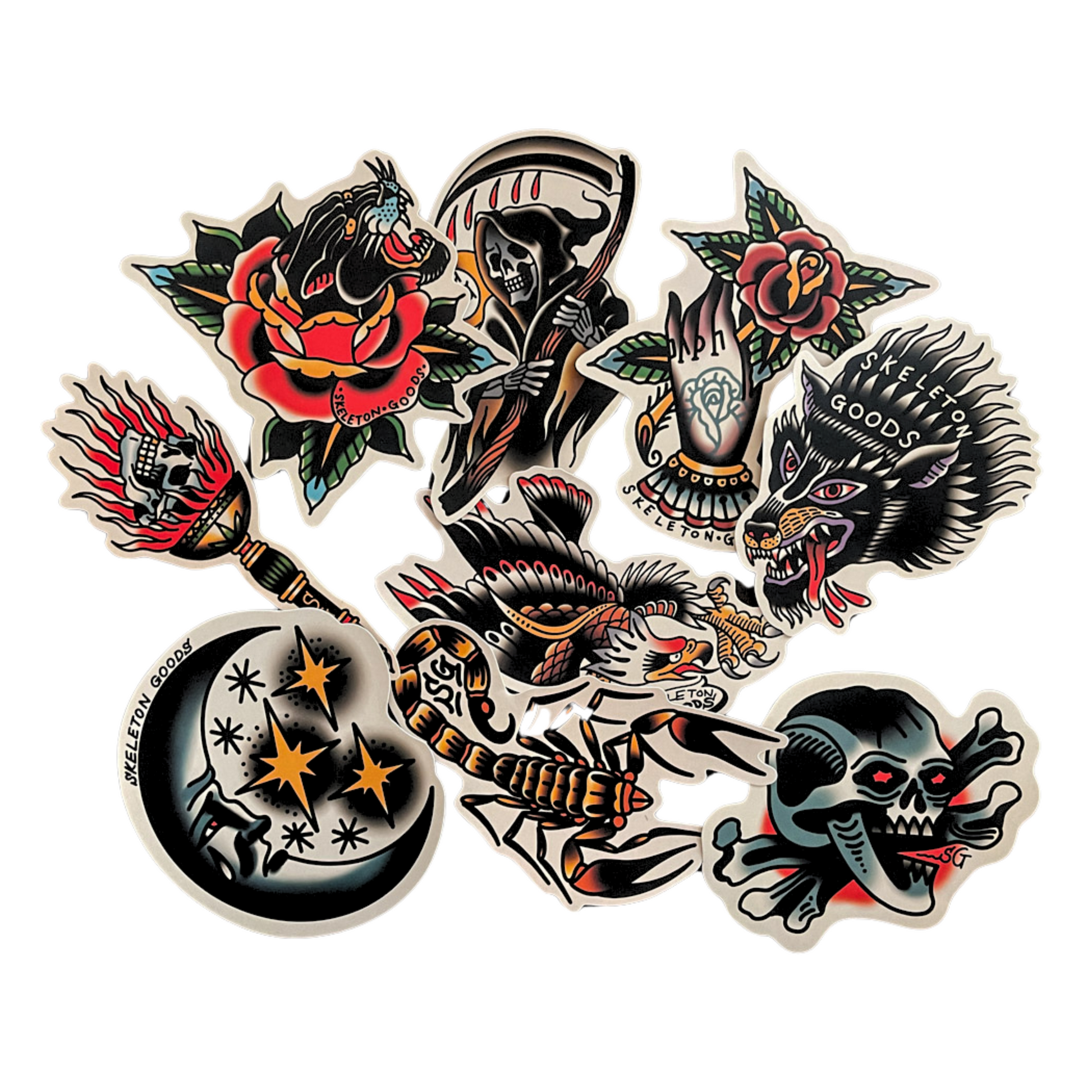 Vibrant and timeless, this 5-Pack of Skeleton Goods Stickers features an array of classic motifs! Each sticker in this set features a unique design inspired by traditional tattoo art. Perfect for adorning your laptop, notebook, water bottle, or any other surface, these stickers add a touch of personality and style wherever they're placed.