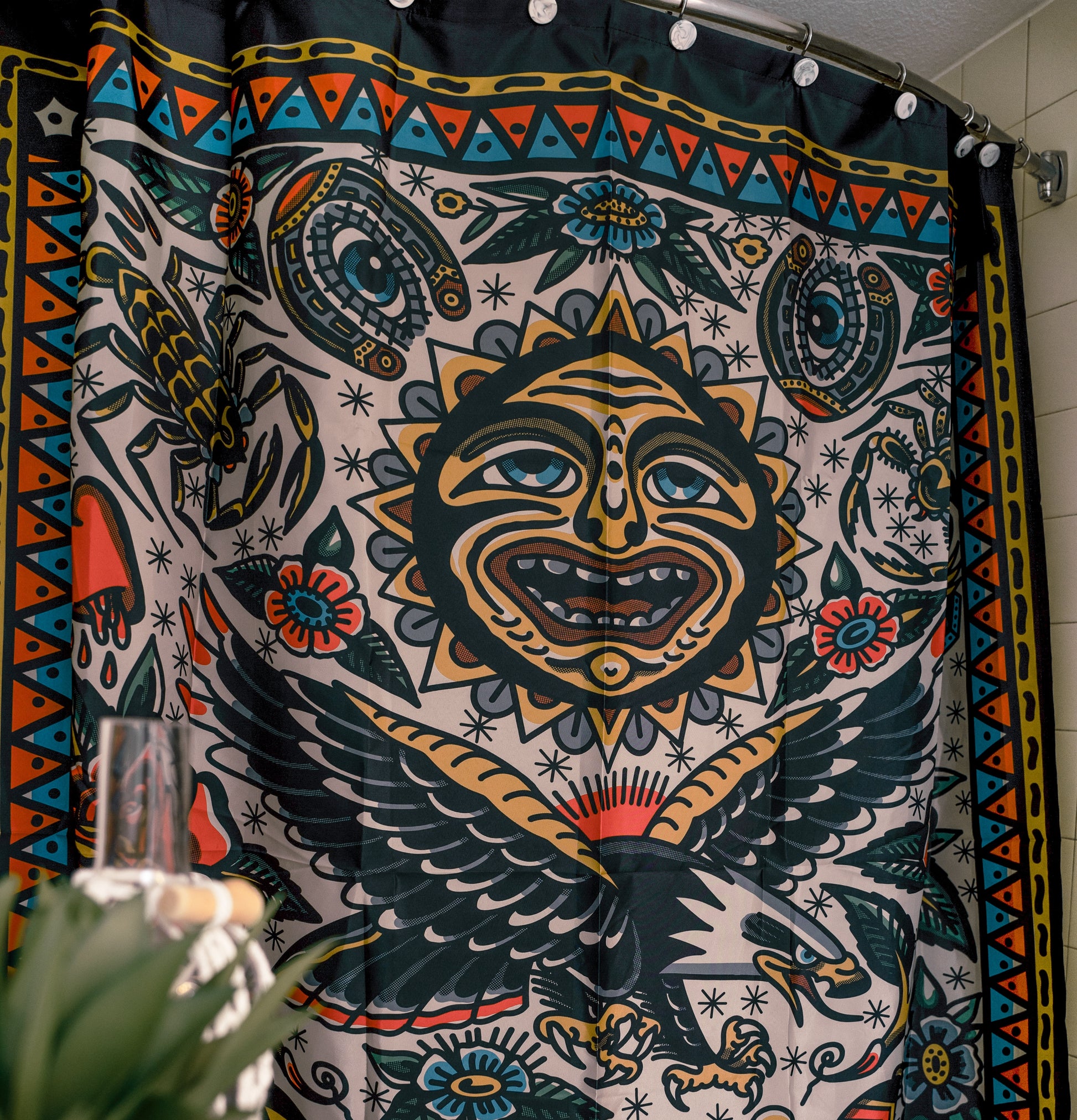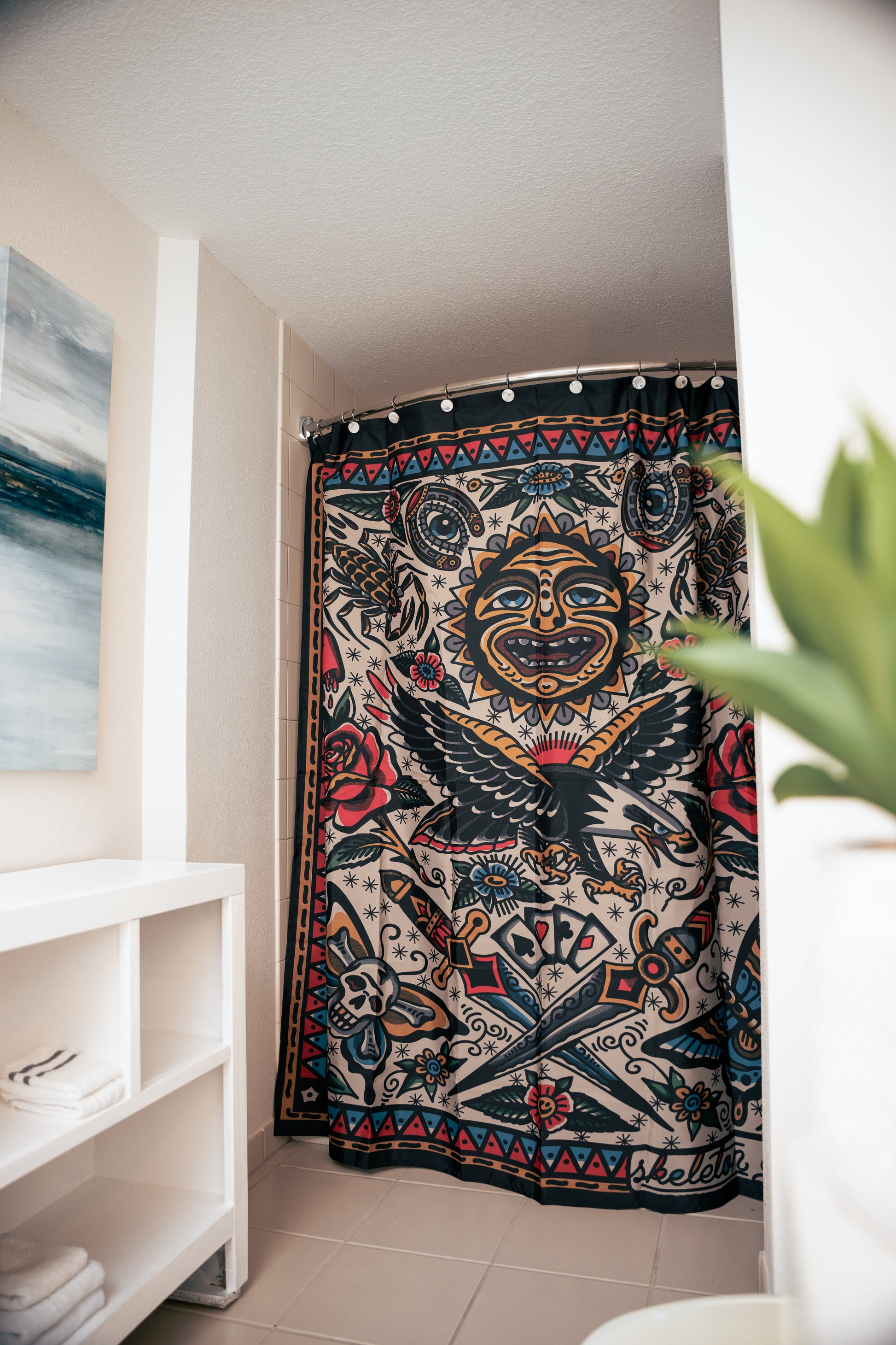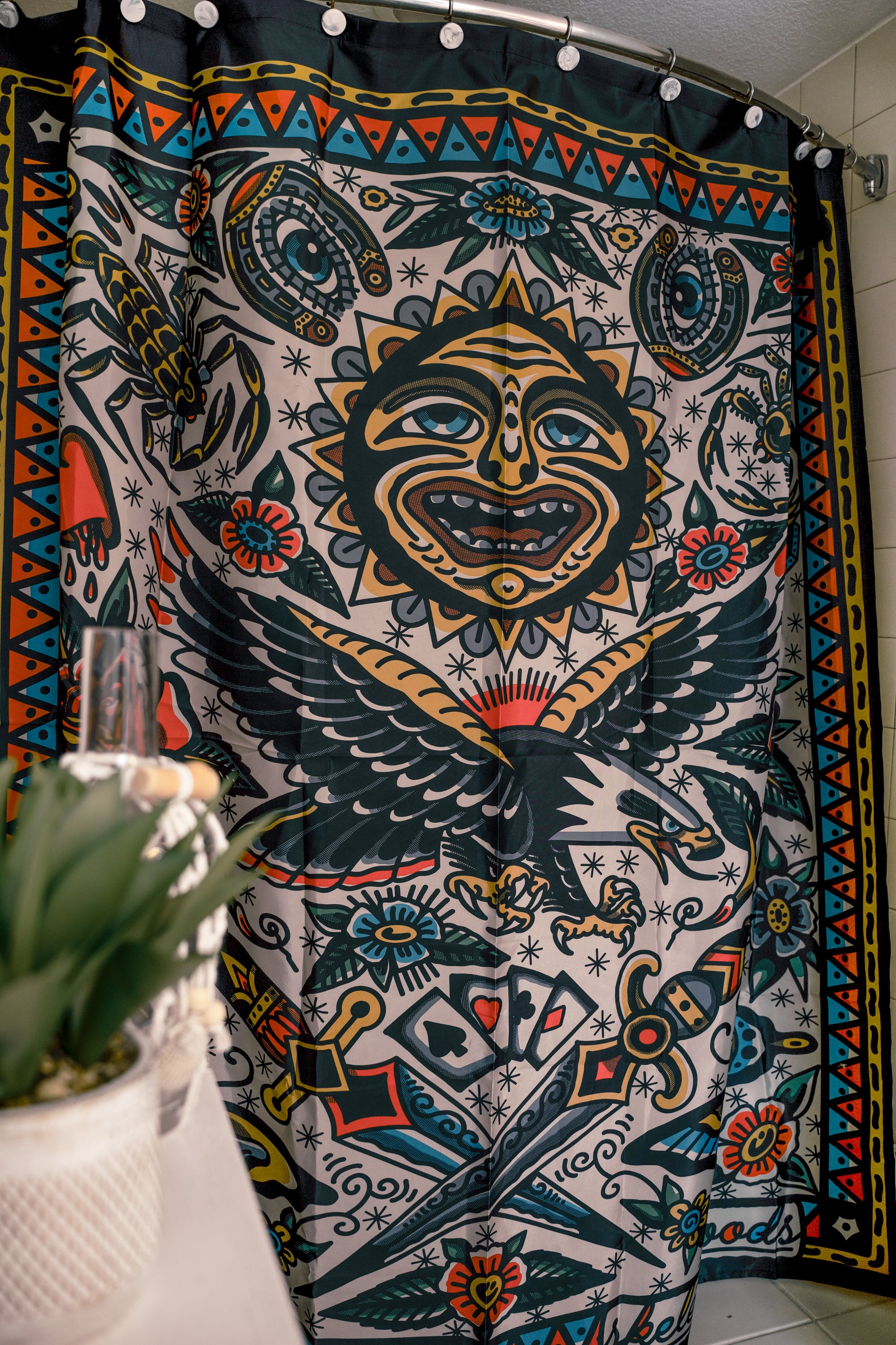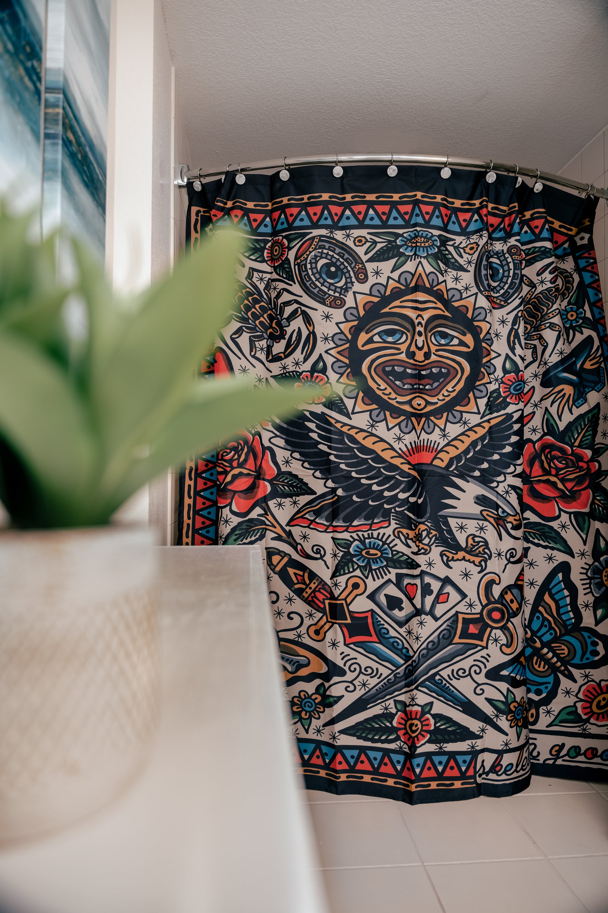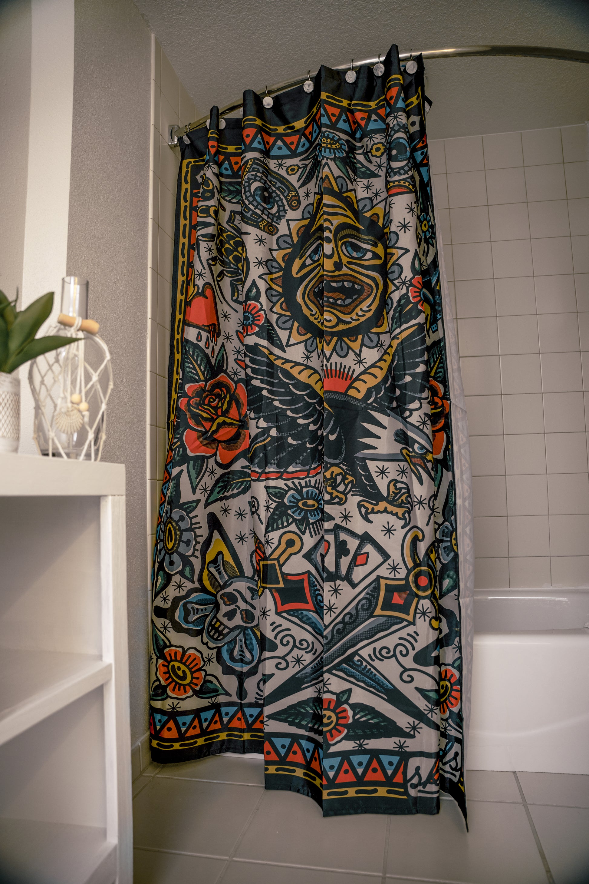 Crafted from high-quality, water-resistant material, this shower curtain adds a bit of edge and color while ensuring practical functionality. Its traditional tattoo design features intricate detailing that instantly elevates the ambiance of your bathroom! Experience luxury and beauty in every shower with our stunning decorative shower curtain.