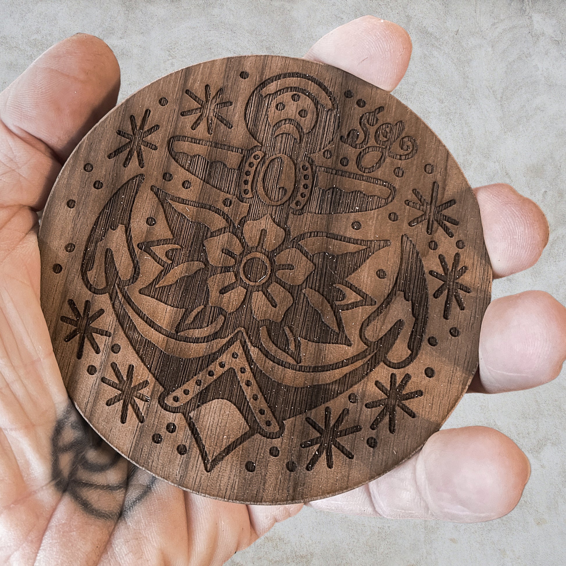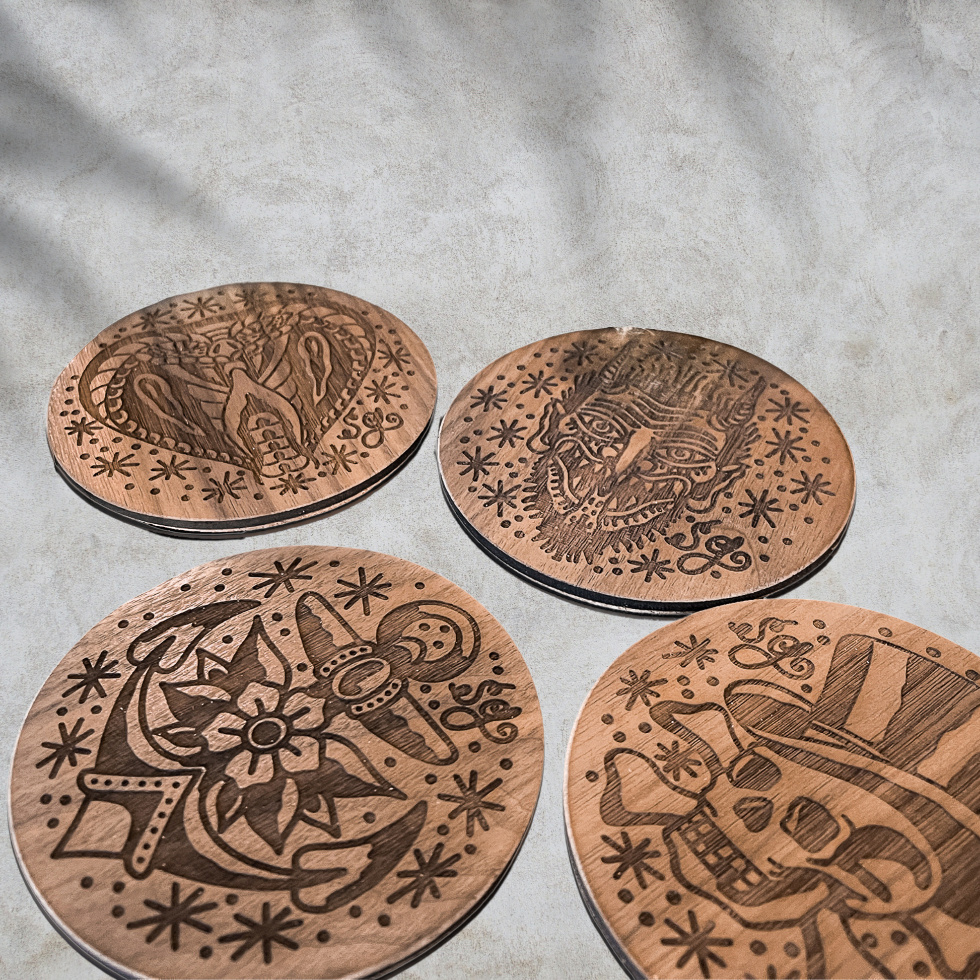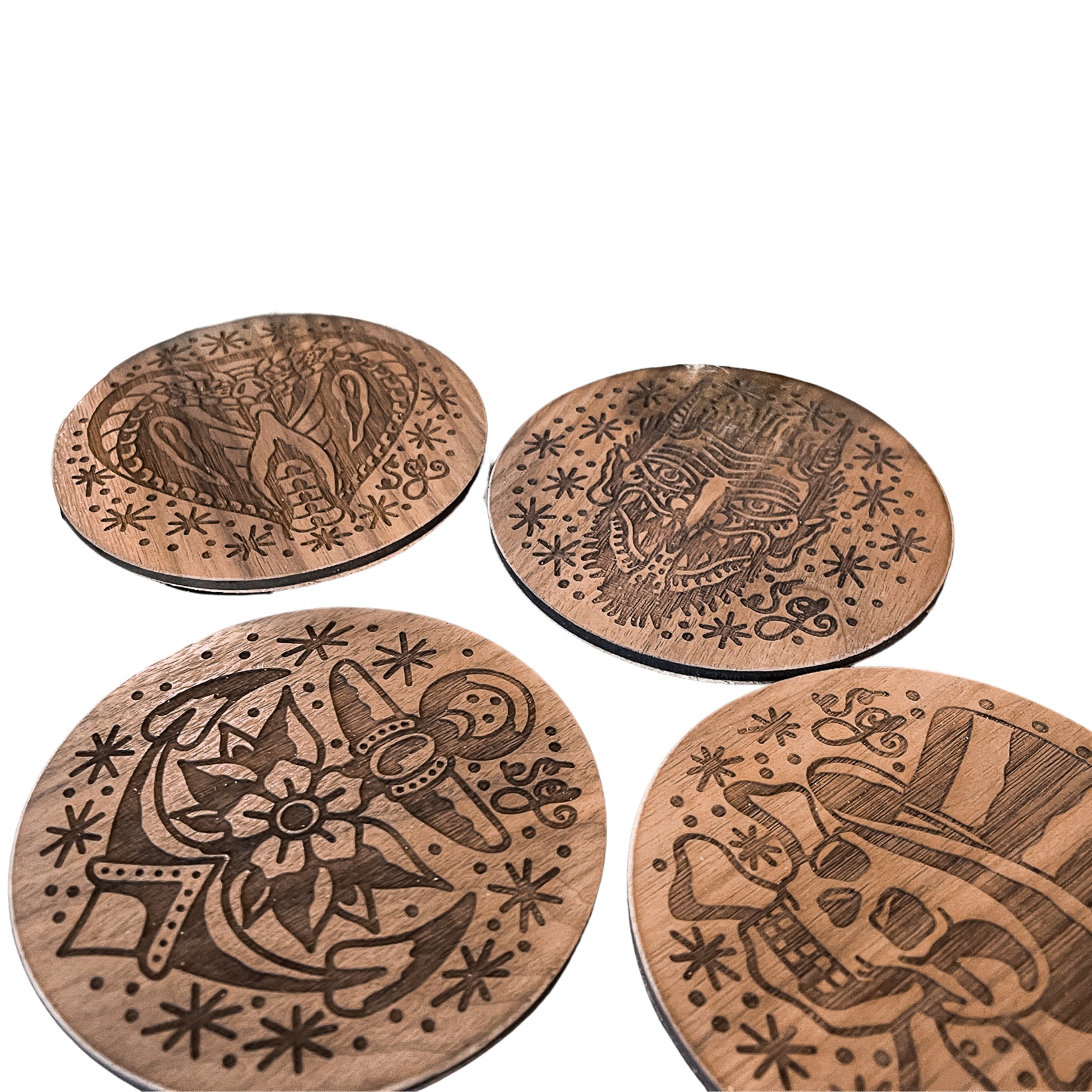 Crafted from rich walnut wood and finished with a cork bottom, these coasters provide both style and protection for your surfaces. Each coaster boasts a unique traditional tattoo design, including a cobra, devil head, anchor, and skull with top hat, adding a touch of personality and flair to your space. Whether you're entertaining guests or enjoying a quiet evening at home, these coasters are the perfect accessory for any tabletop.