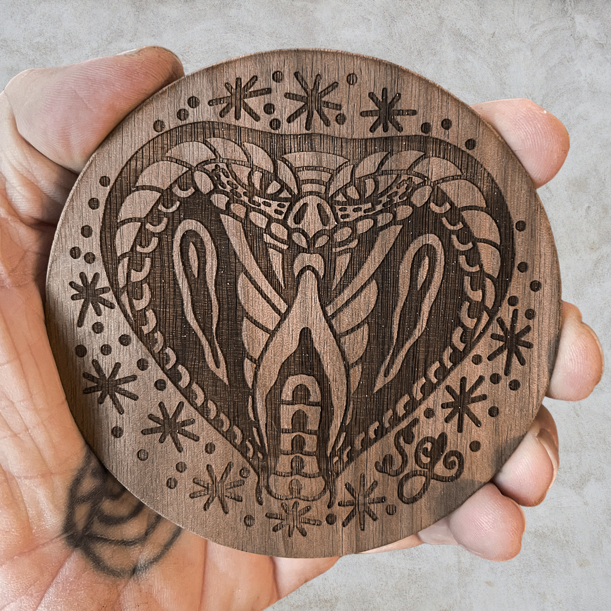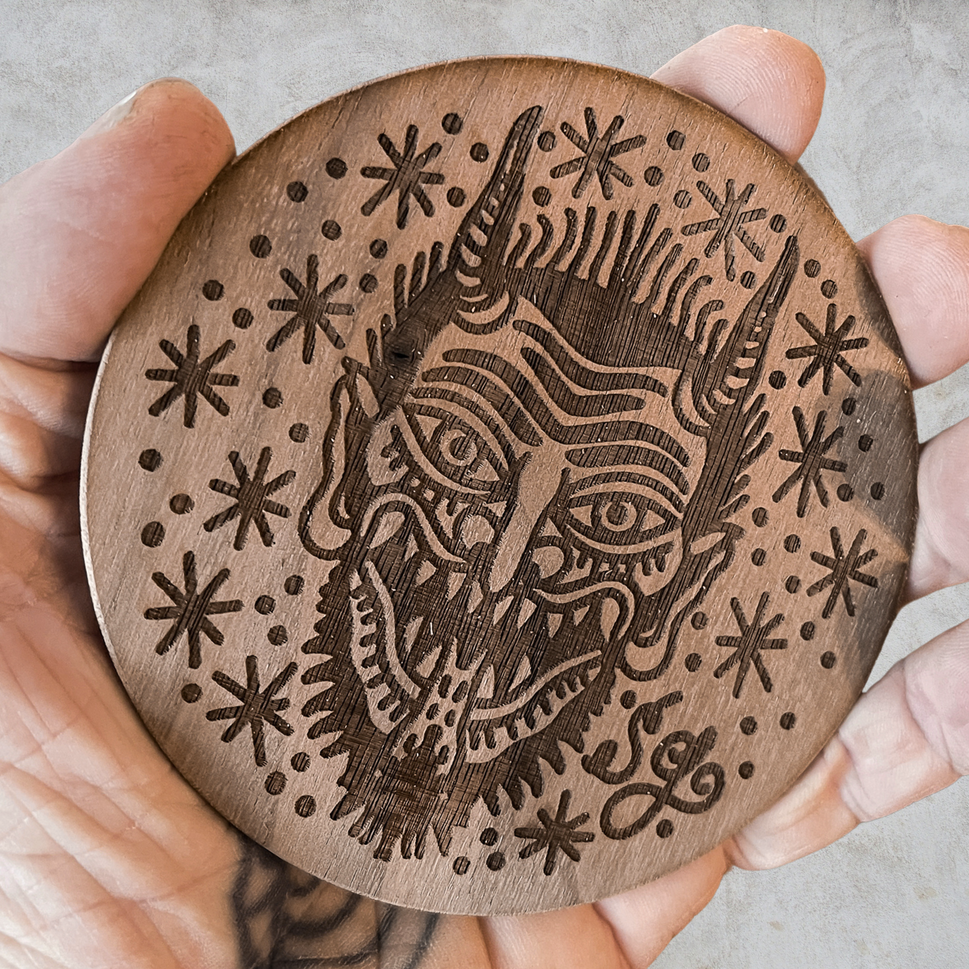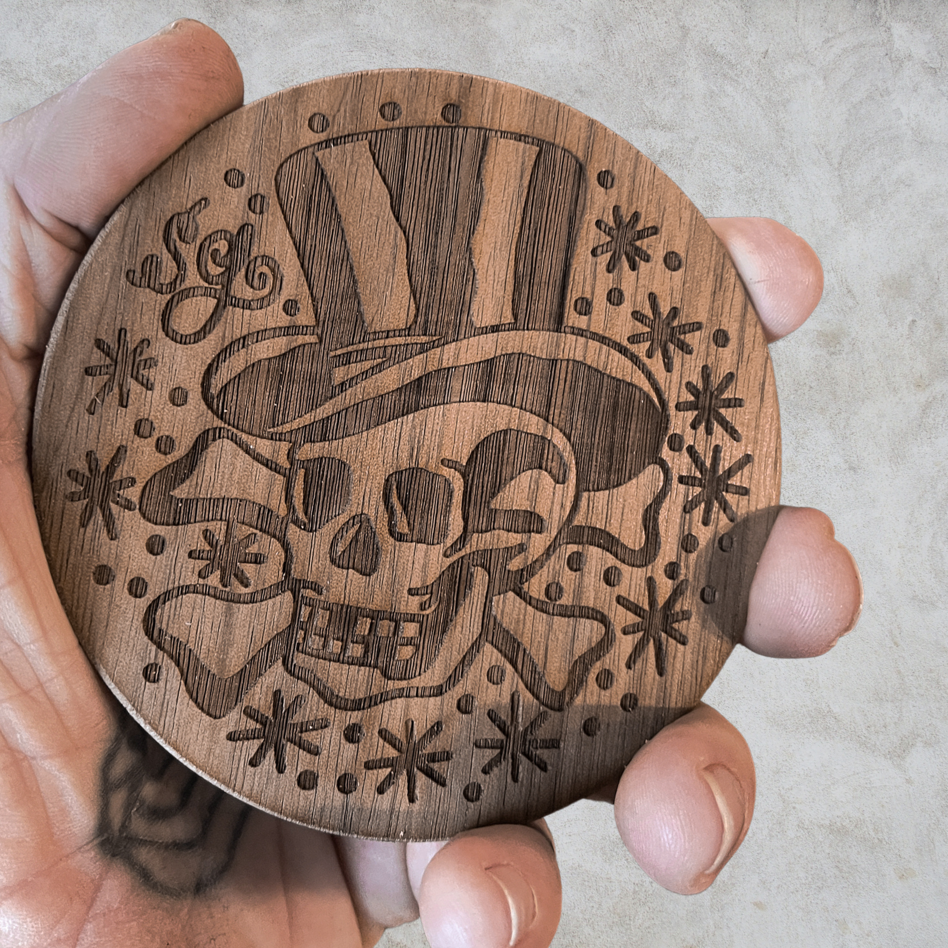 Crafted from rich walnut wood and finished with a cork bottom, these coasters provide both style and protection for your surfaces. Each coaster boasts a unique traditional tattoo design, including a cobra, devil head, anchor, and skull with top hat, adding a touch of personality and flair to your space. Whether you're entertaining guests or enjoying a quiet evening at home, these coasters are the perfect accessory for any tabletop.